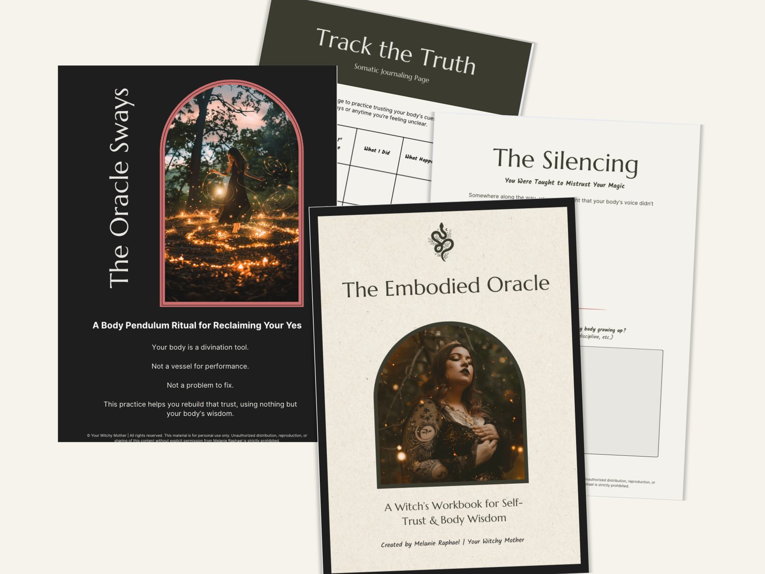 The Embodied Oracle is a self-guided workbook for witches, sensitives, and spiritual rebels ready to stop outsourcing their intuition and start honoring the intelligence of their own body.