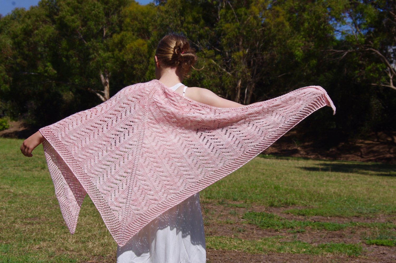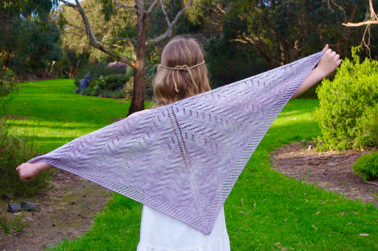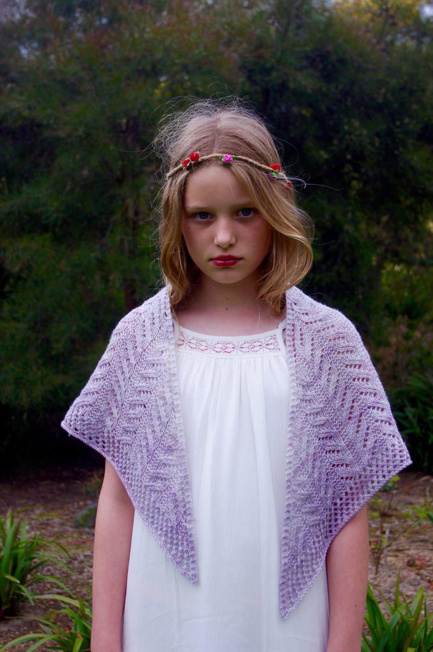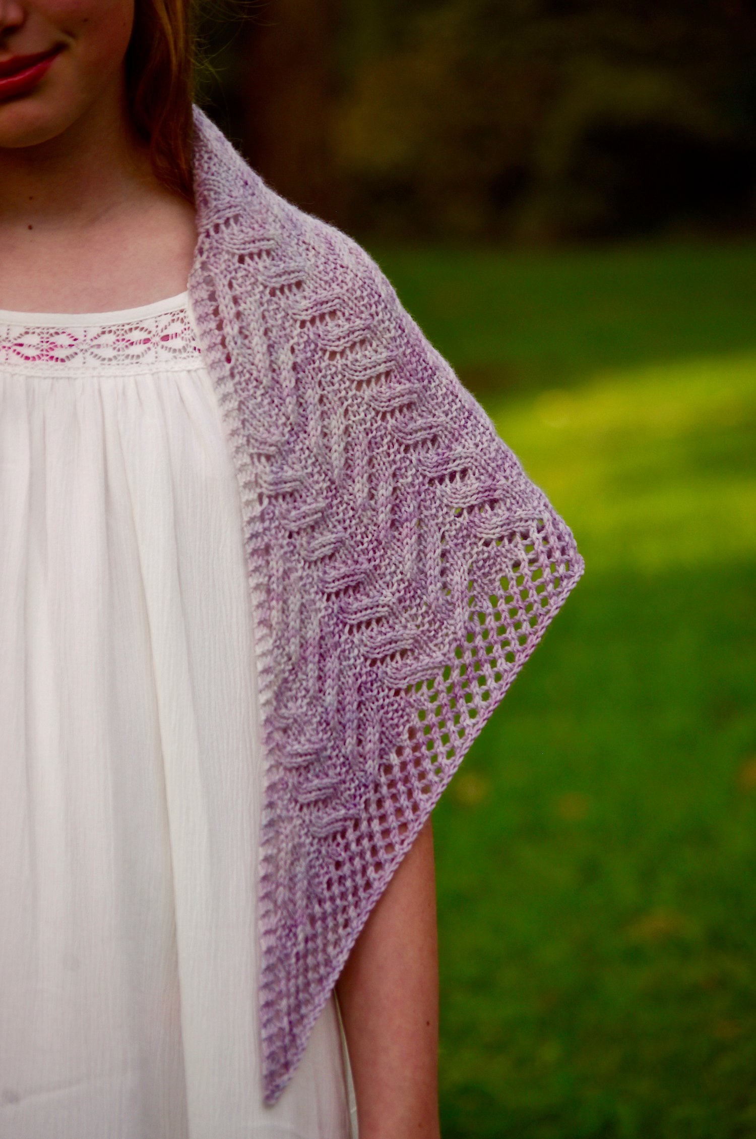 This shawl pays homage to my paternal homeland; the lands of Scorrybreac outside of Portree on the Isle of Skye, Scotland. It is delicate, romantic and airy; whimsical and vintage inspired. The linear nature of the lace pattern catches the eye as it flows through the shawl’s body. This is a simple to knit lace that quickly become intuitive.
