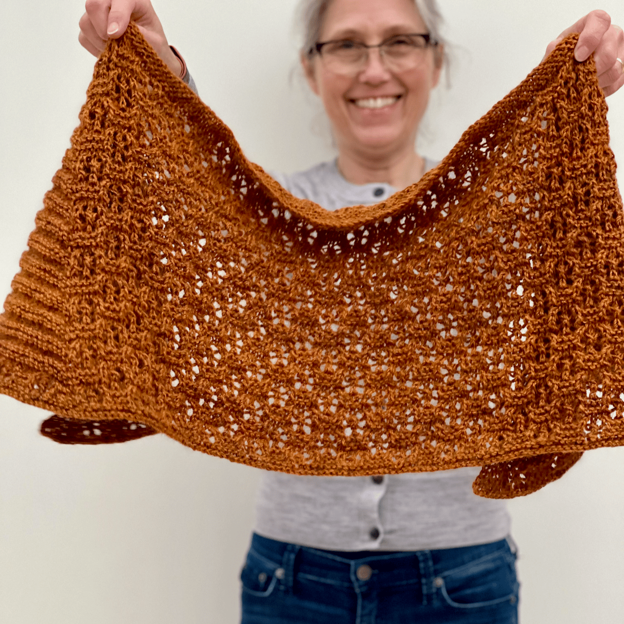 The outer triangles are knitted with garter-stitch ridges separated by bands of stocking stitch. This creates a lovely contrast between the inner and outer parts of the shawl. All three sections are linked at the lower border with the blossom stitch pattern worked across the whole shawl.