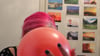 Sanna is doing the balloon challenge, trying out a red and a blue balloon. She tells you how scared she is of the pop and how the loud sound makes her ears ring.