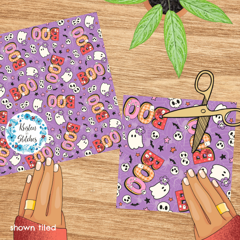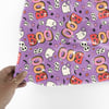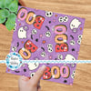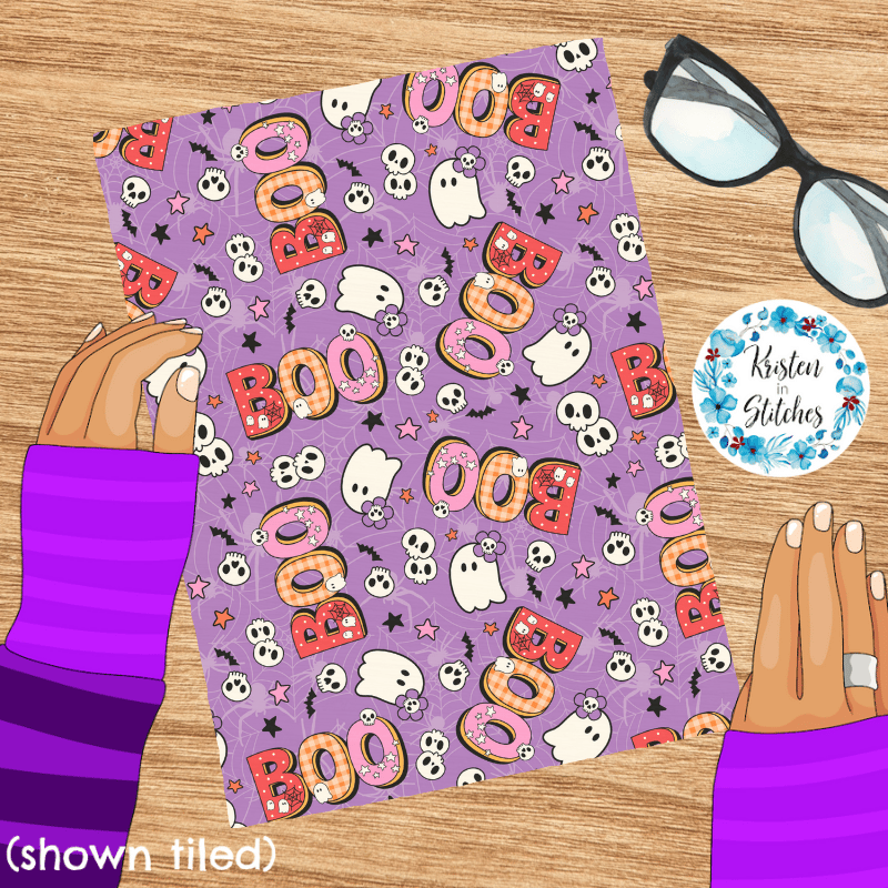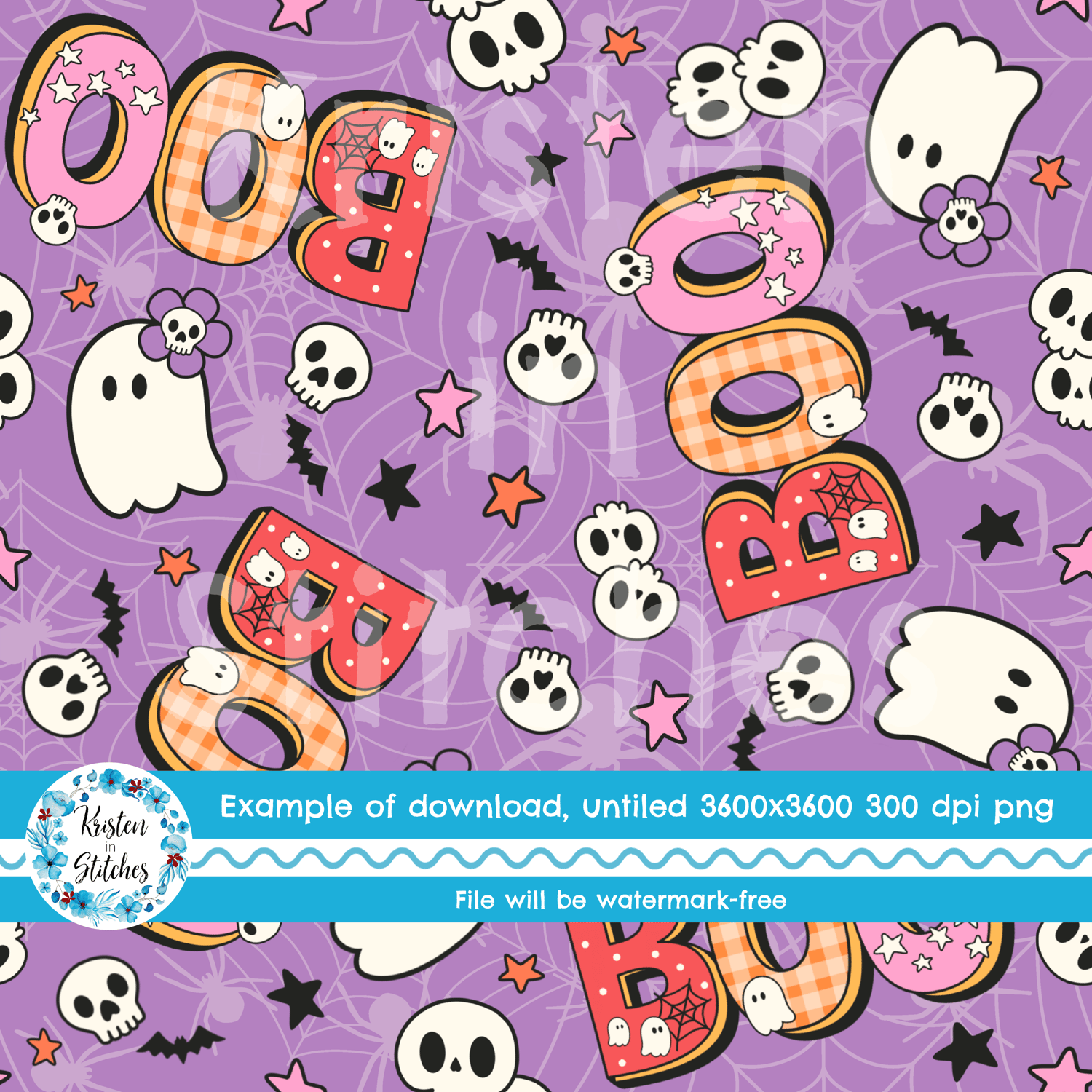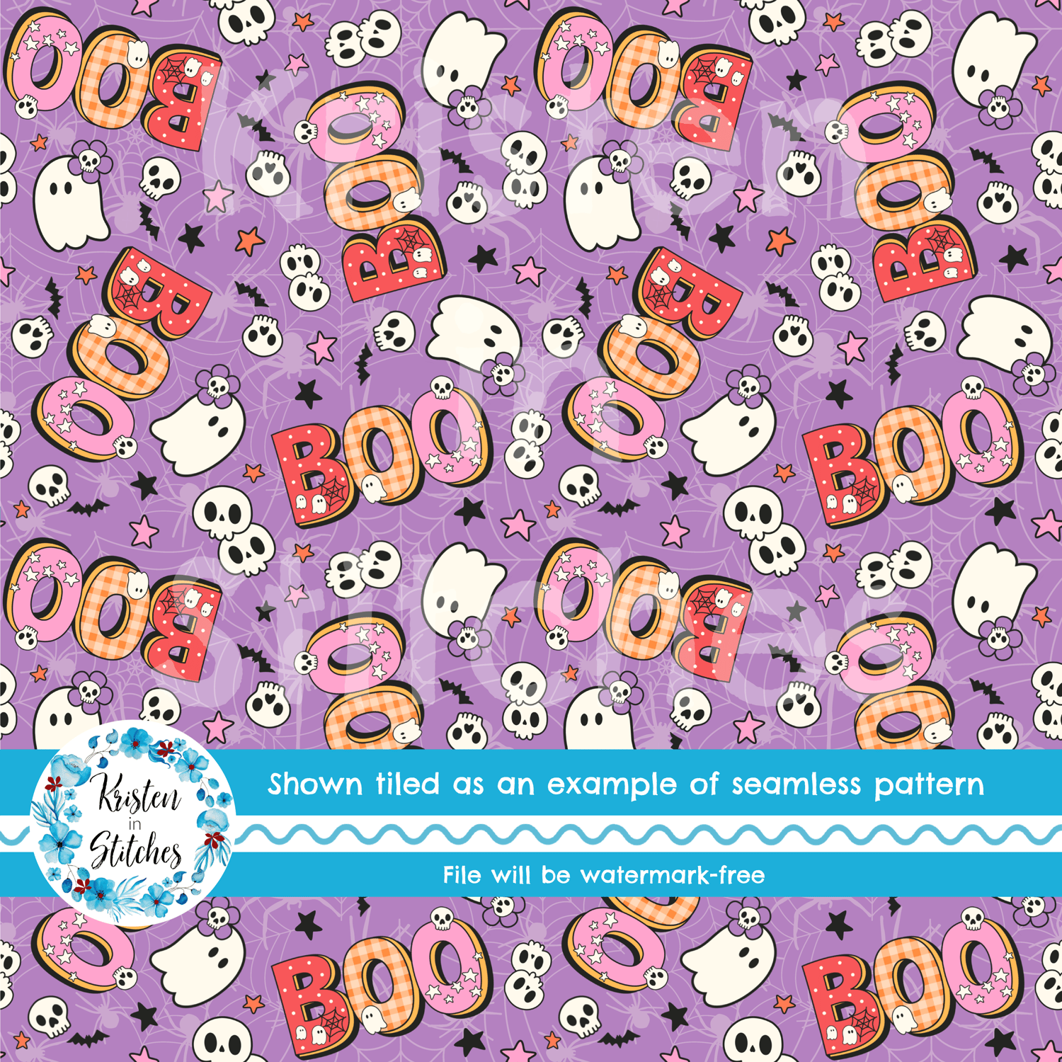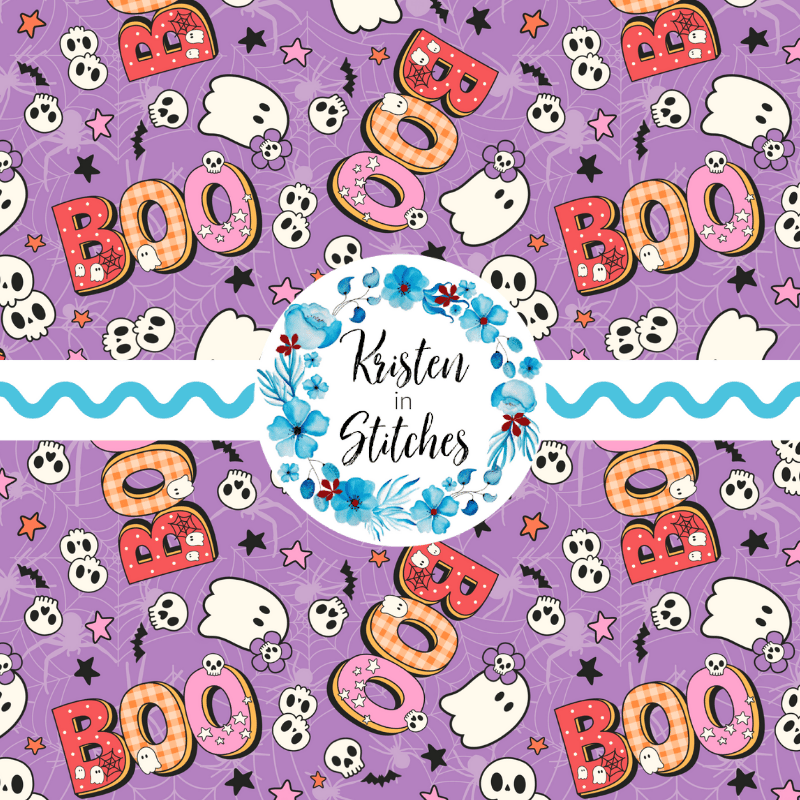 Boo Halloween Ghosts, skulls and bats in pastel colors on purple.