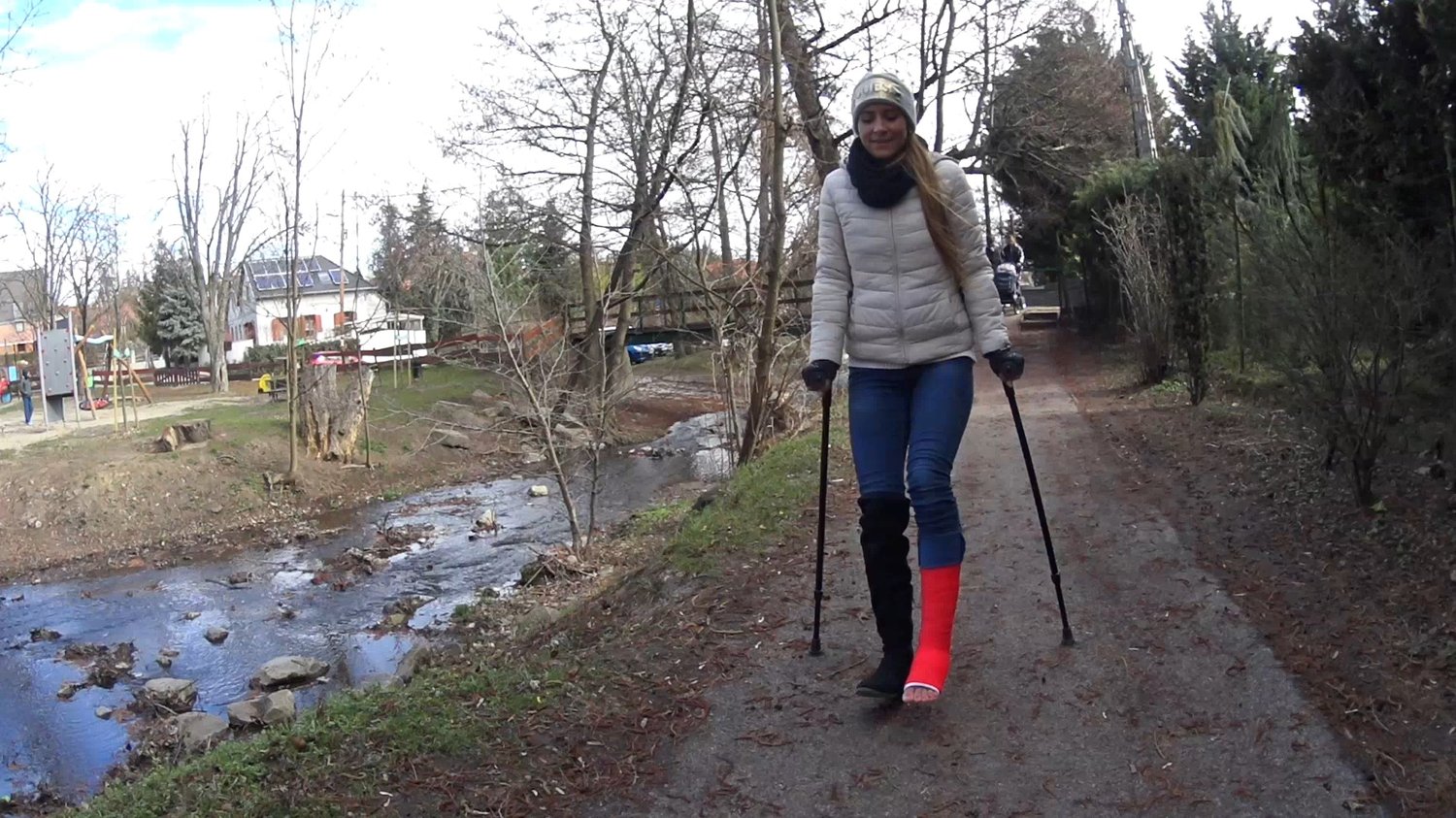 This clip starts with a closeup of Bree´s red SLC and red painted toes.She start crutching in to the park and soon find a bench she can sit down on so she can get a new great closeup of her cast and cute toes.She crutch to a bridge where she shows us how agile she is when she puts her cast on the railing.