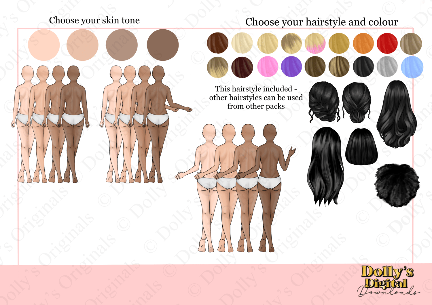 6 Hairstyles included, hairstyles from other packs can be used.