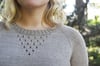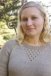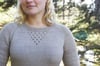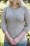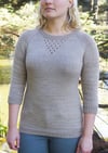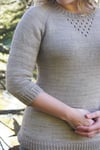 The Trig Sweater is a fitted raglan pullover knit from the top-down. After short rows are knit flat to shape the back neck, the piece is connected in the round. A lovely triangle motif made out of carefully placed eyelets is formed at the top front of the yoke. After the raglan increases are complete and the piece is separated for the sleeves, the body is knit with subtle waist shaping. The sleeves are then knit to a flattering 3/4 length. Ribbing is worked with smaller needles around the neckline to finish off the Trig Sweater.