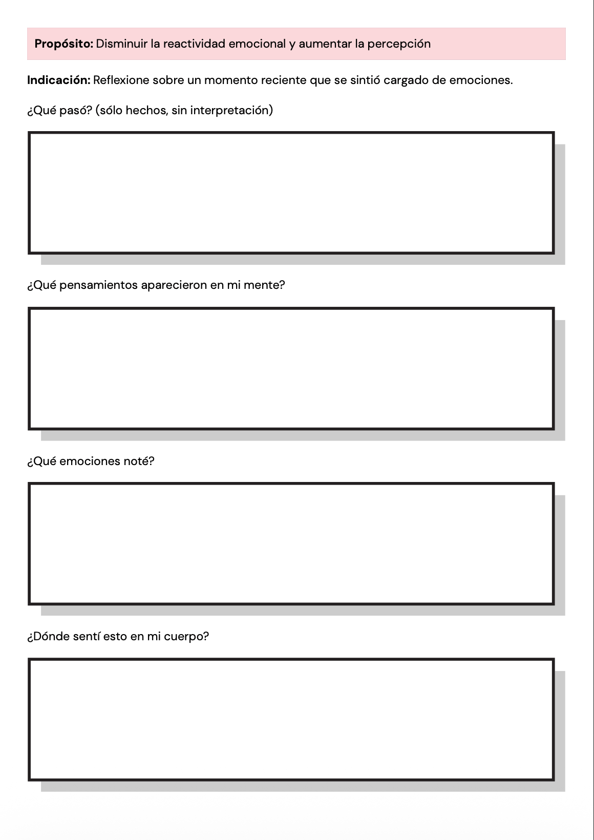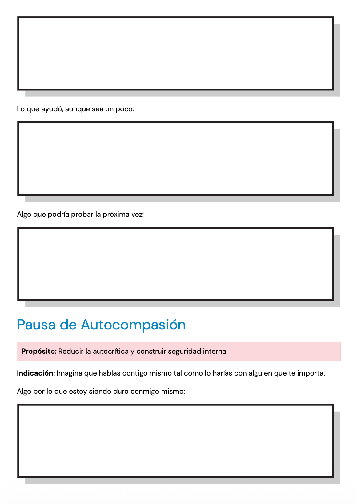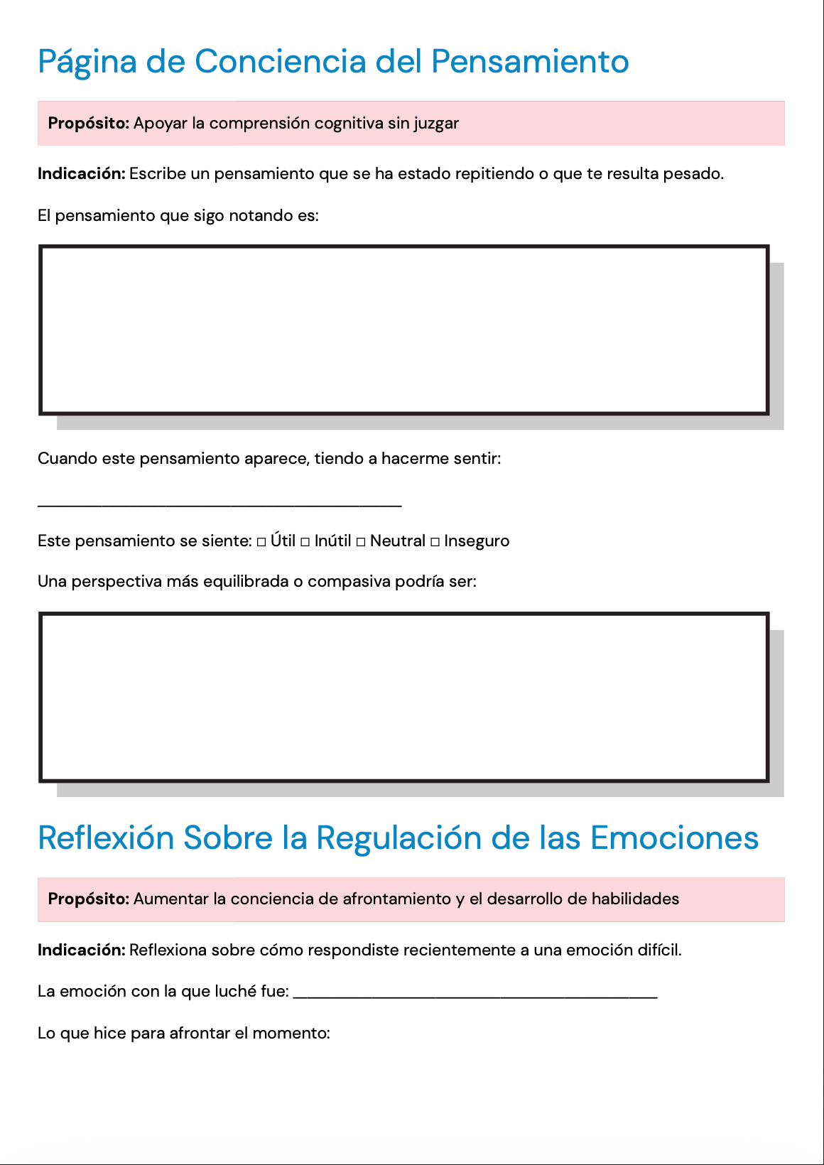 Las páginas están redactadas con un lenguaje claro, neutral y apropiado para personas adultas, lo que las hace adecuadas para una amplia variedad de clientes y enfoques terapéuticos. Pueden utilizarse en terapia individual, terapia grupal o como reflexión entre sesiones para profundizar el insight y apoyar el procesamiento emocional.