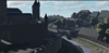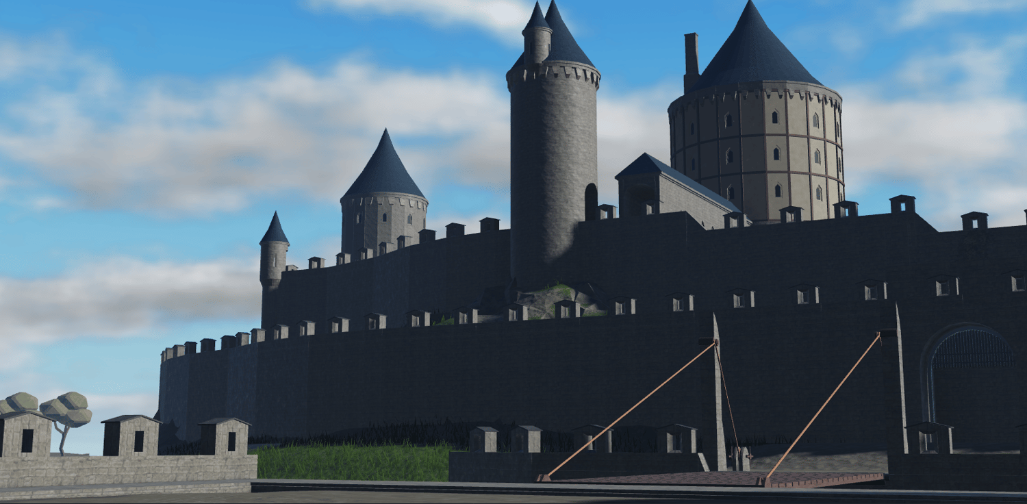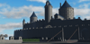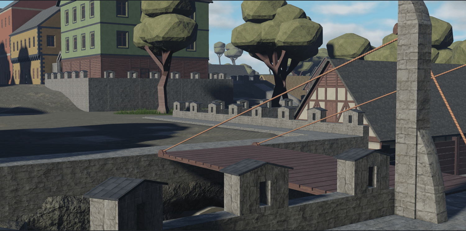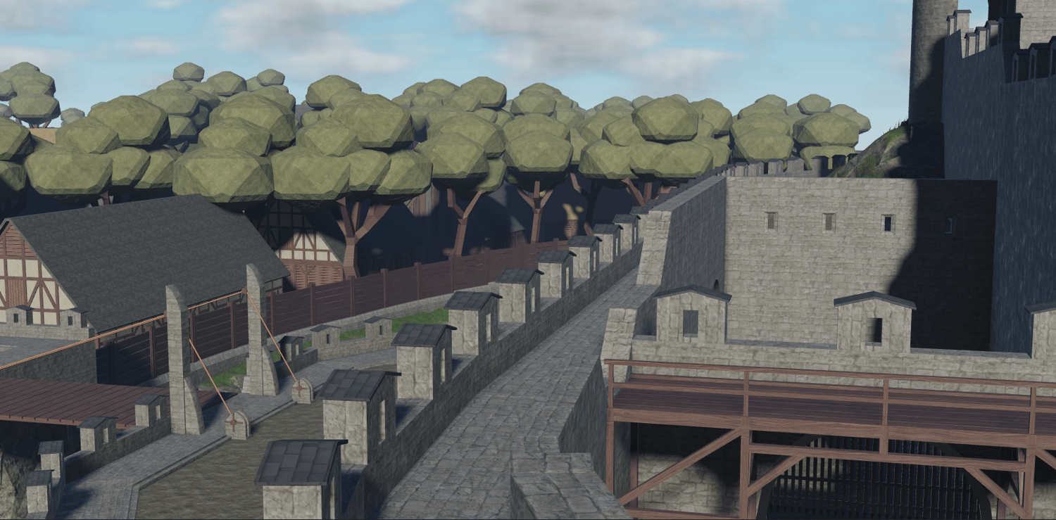 A small village sits outside the gates, with thatched roofs and candlelight glowing through windows.