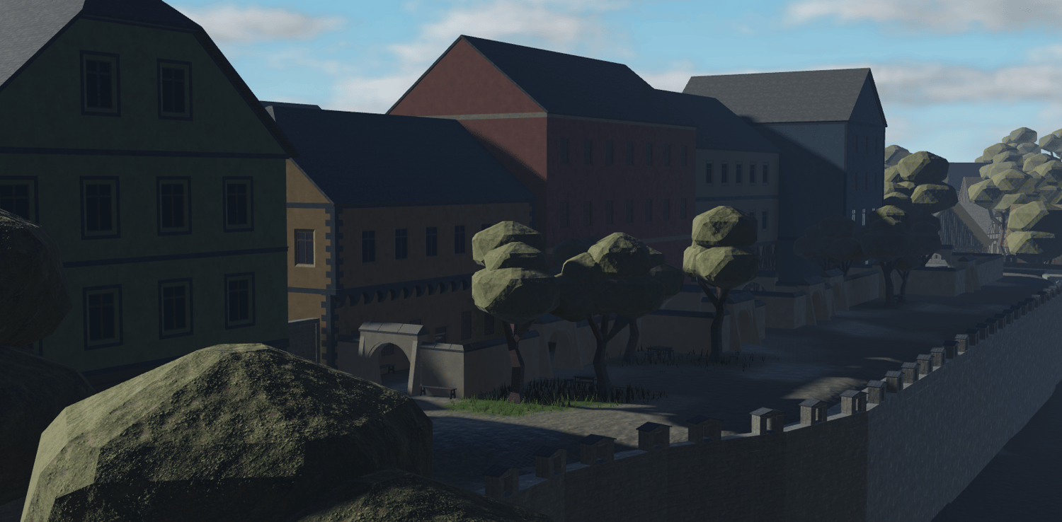 Beyond the walls, quiet fields and dark woods stretch out under the silver moonlight.