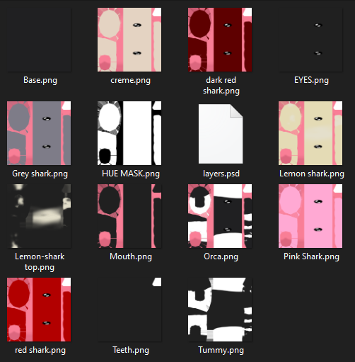 - 5 separated pngs (Base, lemon shark gradient, Tummy, eyes, mouth layer, and teeth)