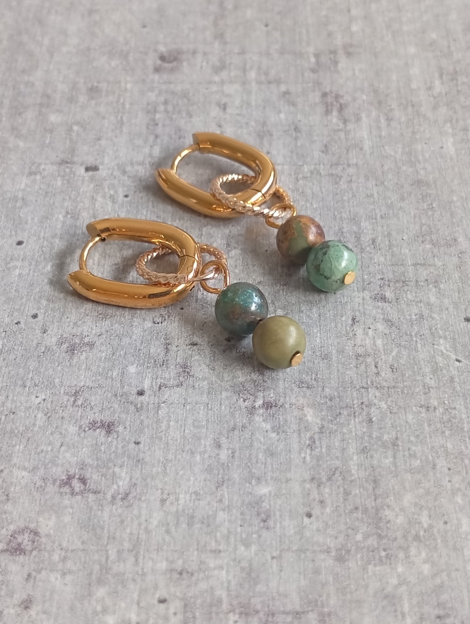Boucles d’oreilles en turquoise naturelle, montées sur attaches dorées. Une création solaire et protectrice, idéale pour apporter équilibre, courage et expression libre dans le quotidien.