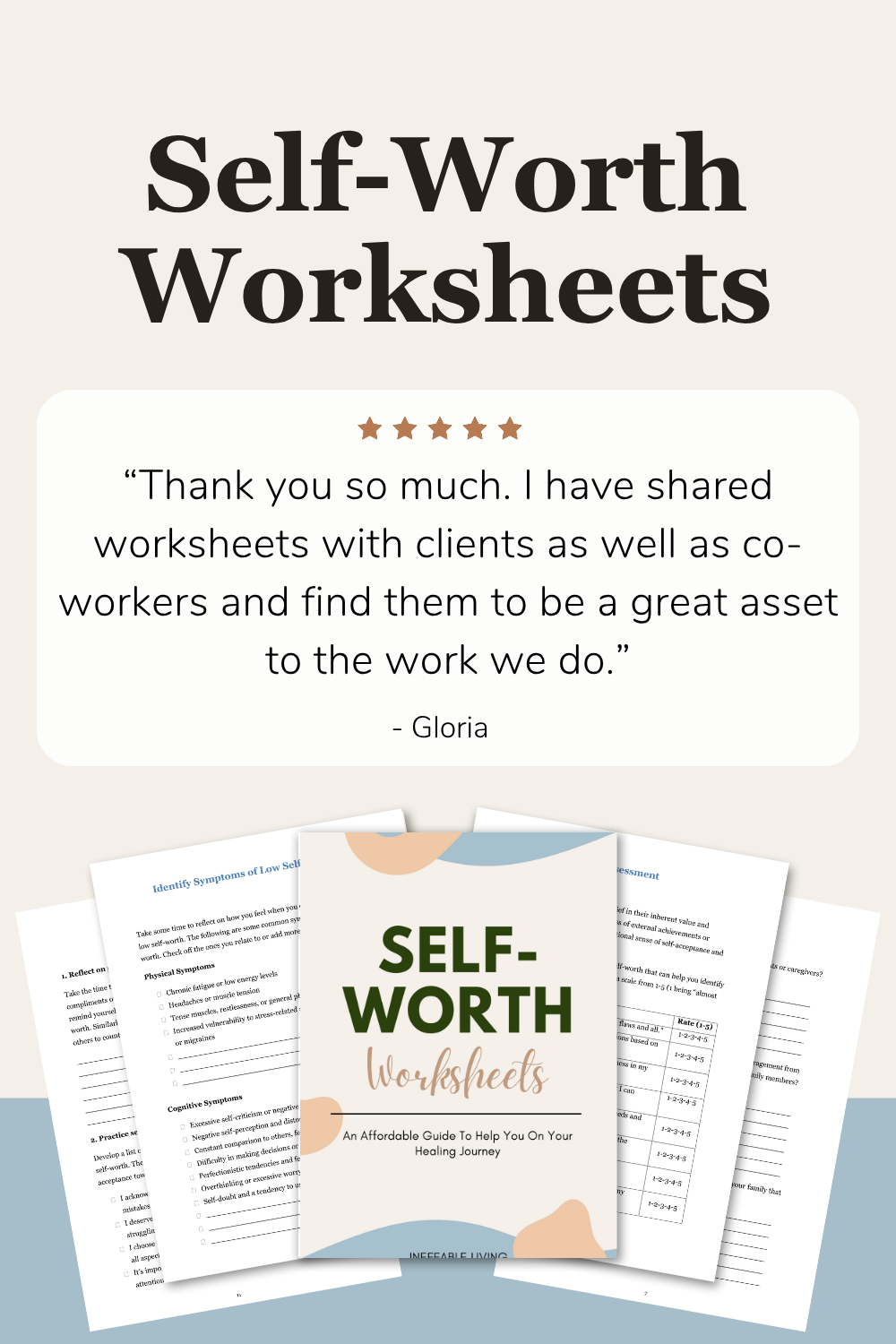 Self-worth worksheets help you counteract negative self-perceptions and recognize and cultivate a mindset shift towards focusing on what you value and appreciate about yourself rather than dwelling on perceived shortcomings.