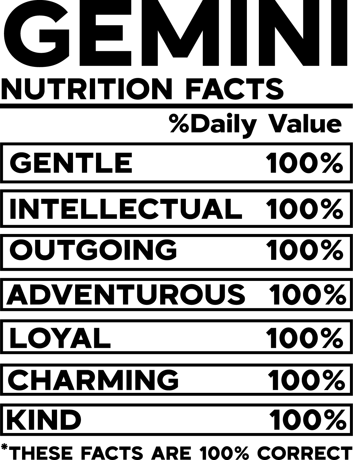 Celebrate the intelligent, adaptable, playful energy of a Gemini with this bold “Gemini Nutrition Facts” design. The clean label-style layout highlights their quick-witted and dynamic personality perfectly.