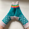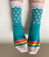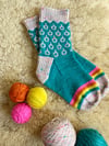 A top-down sock that celebrates rainy days. The Rainburst Socks have a twisted rib cuff, easy-to-memorize stranded colorwork, and heel-flap-and-gusset construction. The rainbow stripes are a fun way to customize your socks.