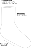 6.5 (7.5, 8.5, 9.5)” / 16.5 (19, 21.5, 24) cm. Designed to fit with about .5” / 1 cm negative ease. Leg length: 5.75” / 14.5 cm