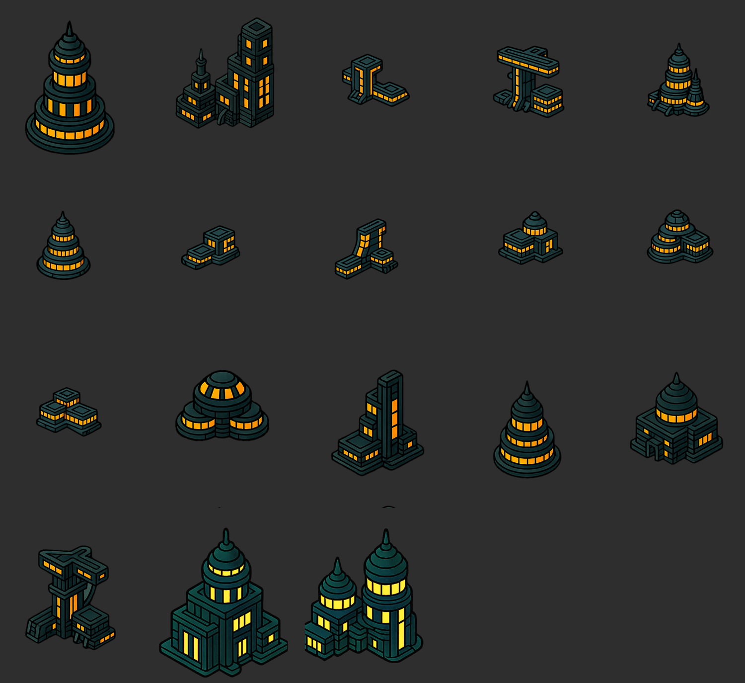 Dark, illuminated skylines define this civilization’s architecture, where tiered towers and interlinked structures form dense, adaptable cityscapes. Warm golden lighting contrasts against deep façades, creating a striking visual identity both in sprawling districts and compact urban hubs.
