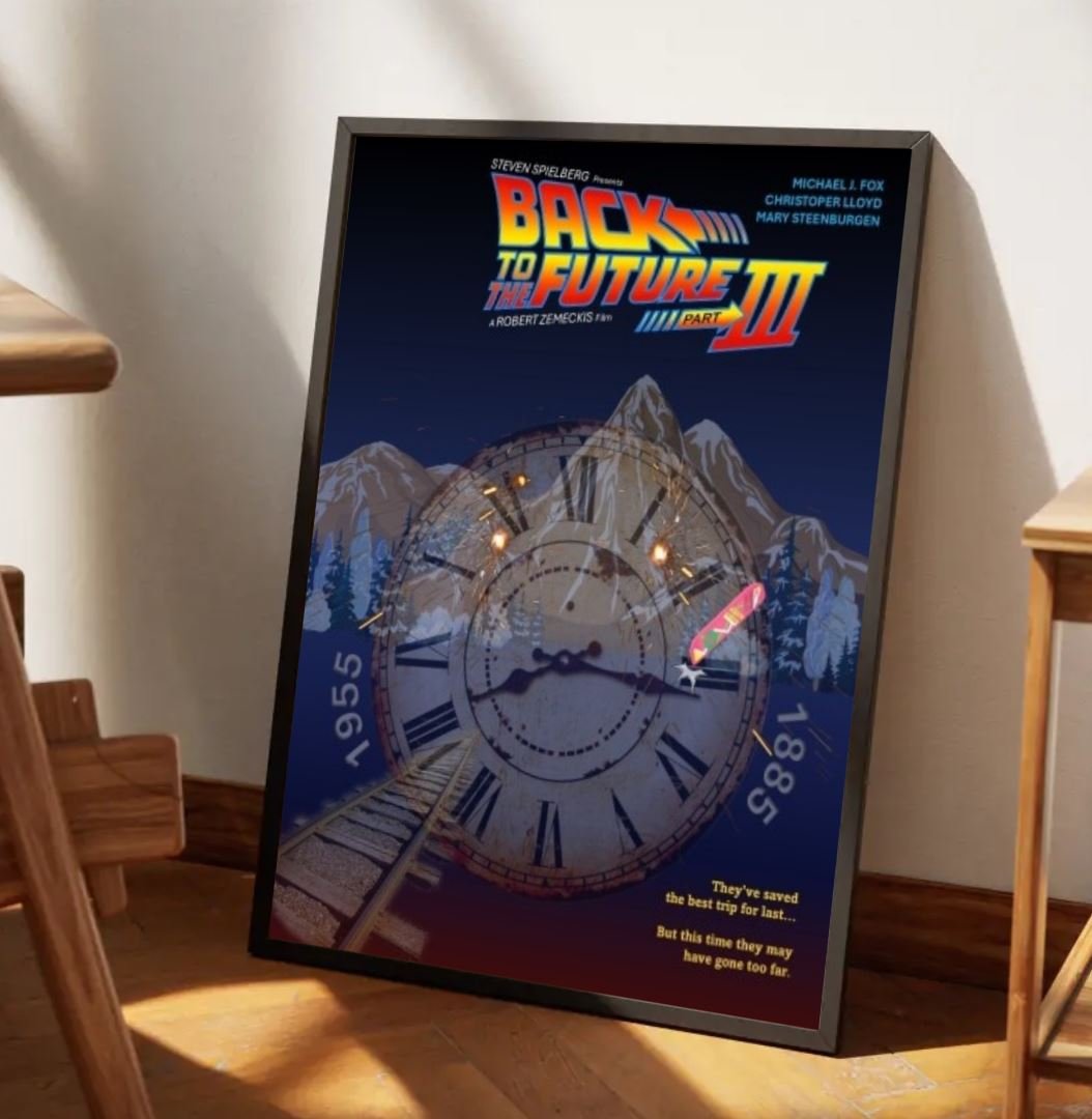✅ Iconic design inspired by the movie – Mountain backdrop, railway tracks leading to the clock, and the cult Back to the Future Part III logo.