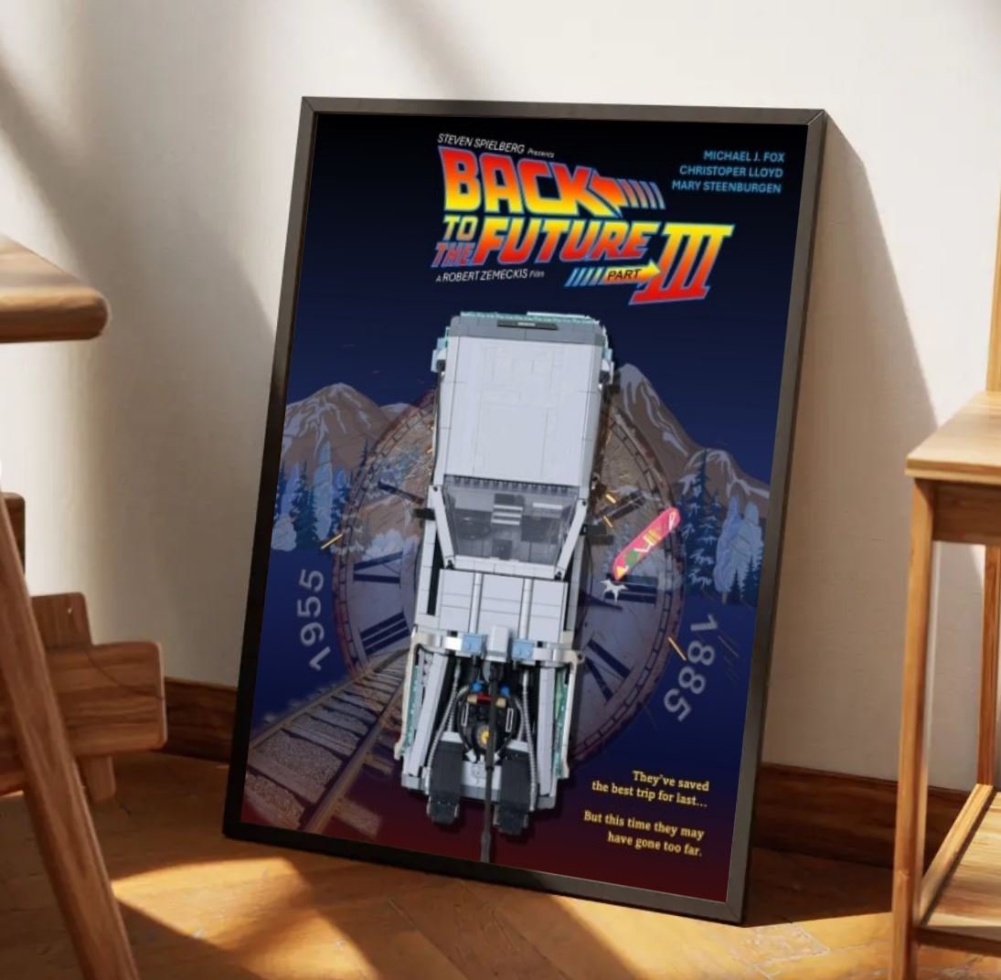 🚂 Showcase your LEGO Back to the Future DeLorean (set 10300 – 1872 pieces) with this exclusive retro poster in 40x50 cm (16x20 in) format, designed to highlight the epic conclusion of the trilogy!