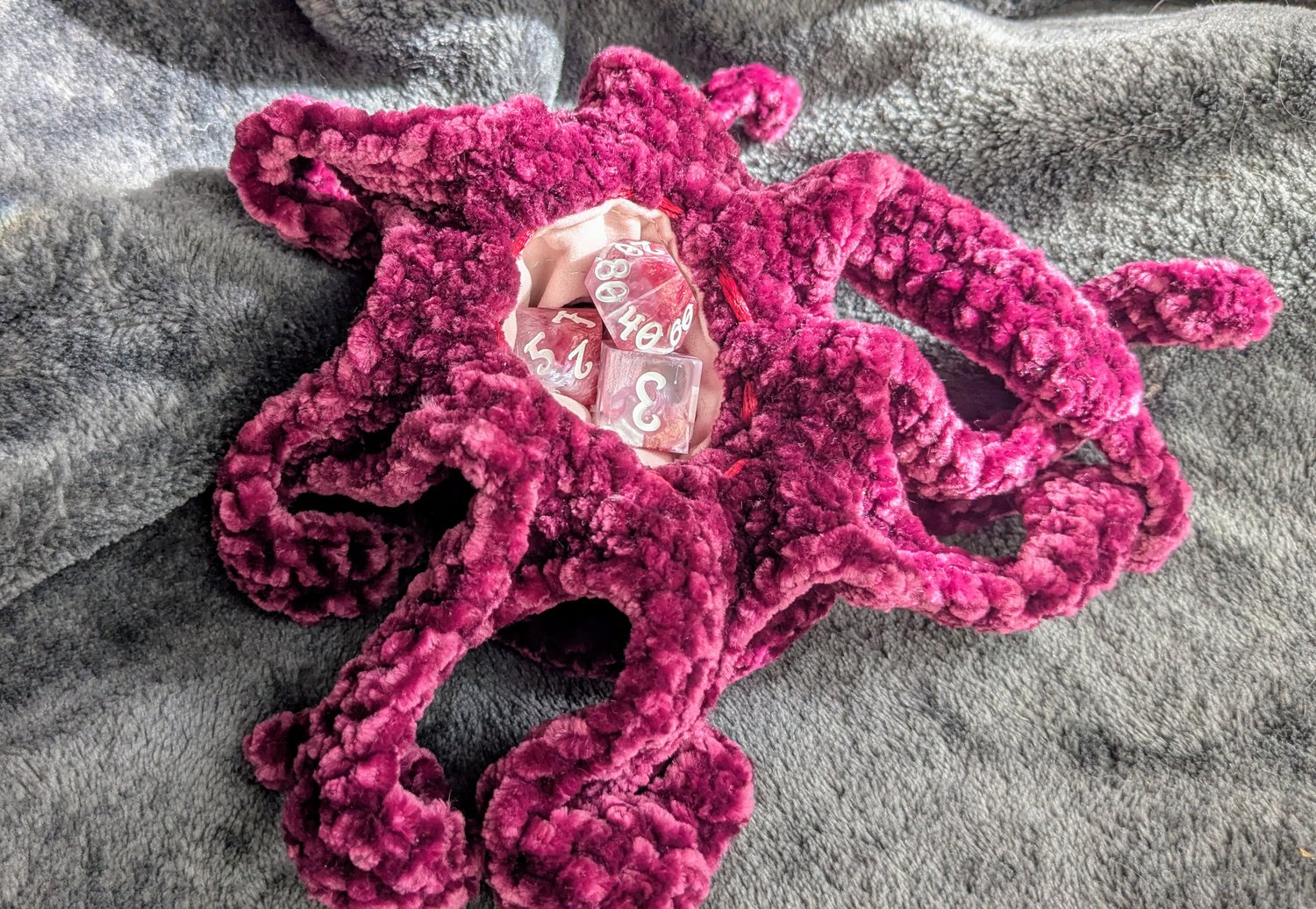 Each Kraken Dice Bag is hand-crocheted with ultra-soft velvet yarn and features a fully lined velvet interior for luxurious protection of your dice, jewelry, or other small keepsakes. A secure drawstring closure ensures nothing escapes from this Kraken's grasp.