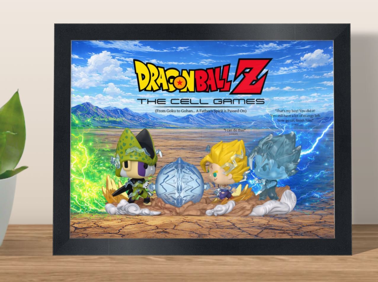 This poster is designed to enhance your Funko Pop figures inspired by the legendary Dragon Ball Z – Cell Games saga.