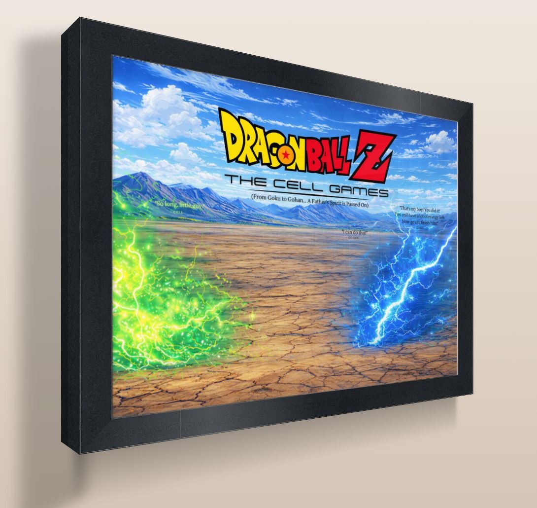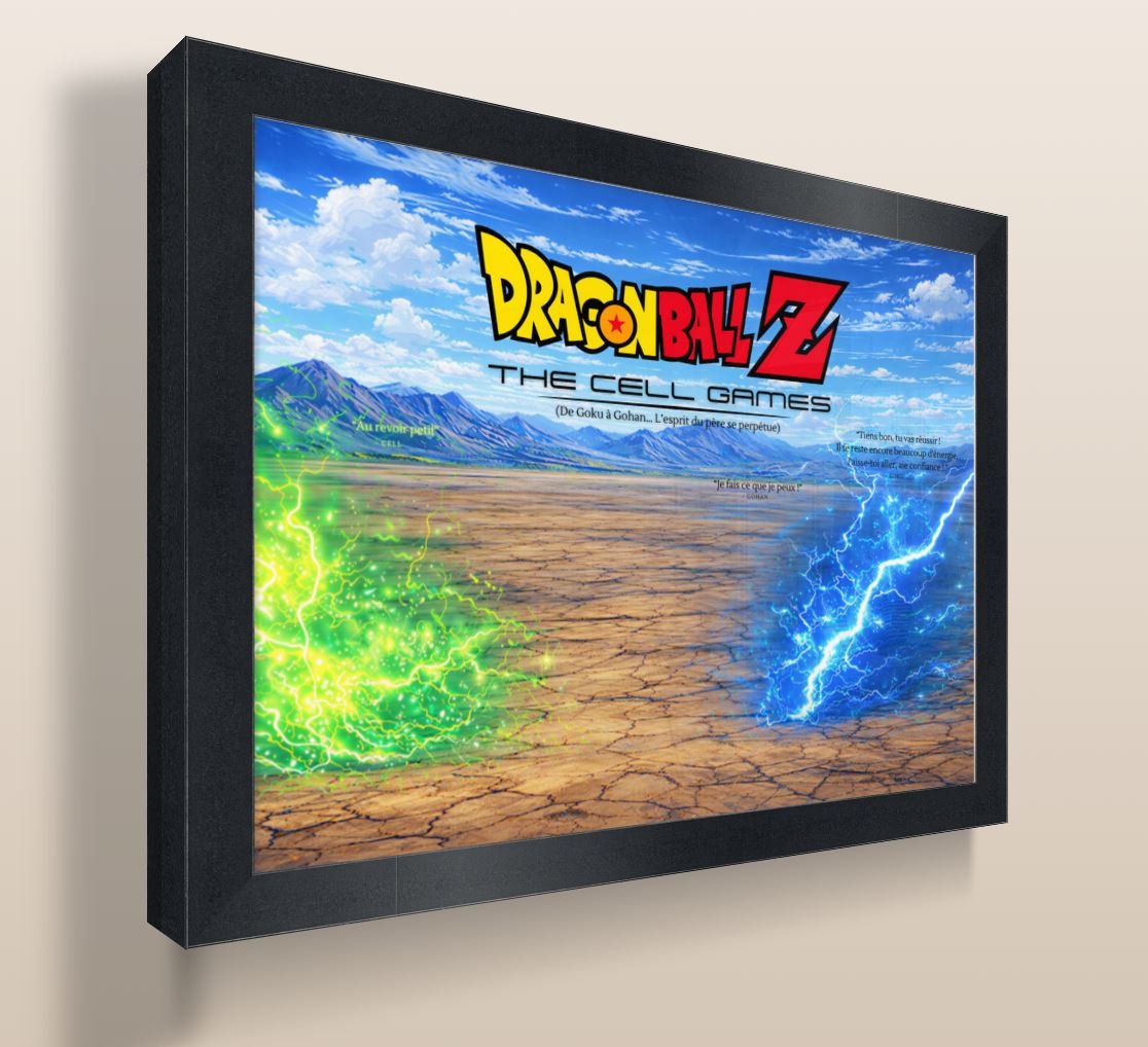 Elle représente l’affrontement emblématique entre Gohan, Cell et Goku, dans un décor désertique intense, avec des effets d’énergie verte et bleue, fidèles à l’univers du manga et de l’anime.