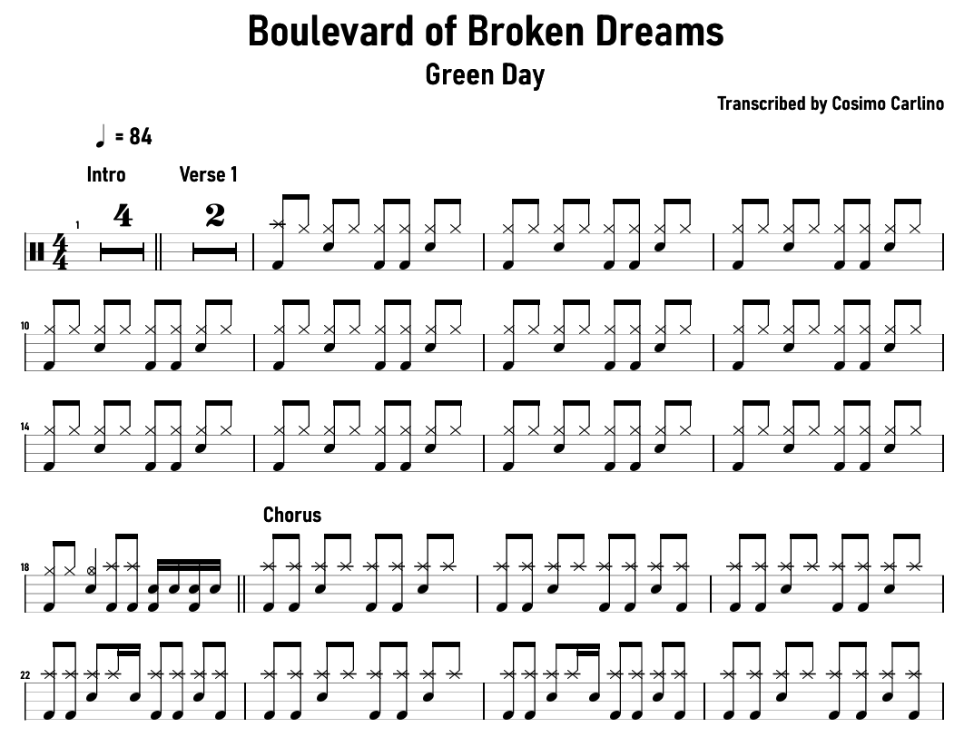 Boulevard of Broken Dreams - Green Day - Full Drum Transcription in PDF