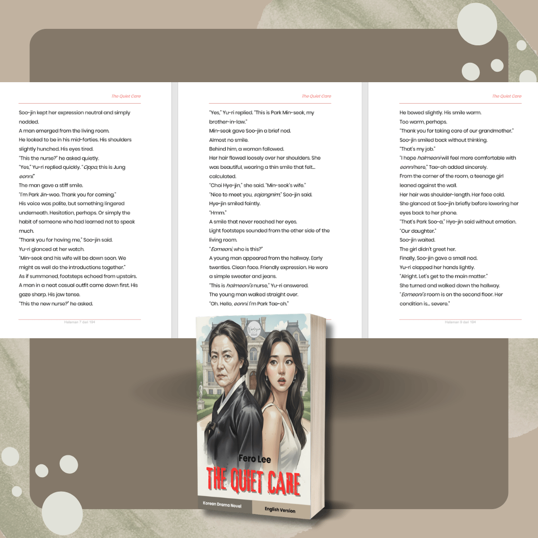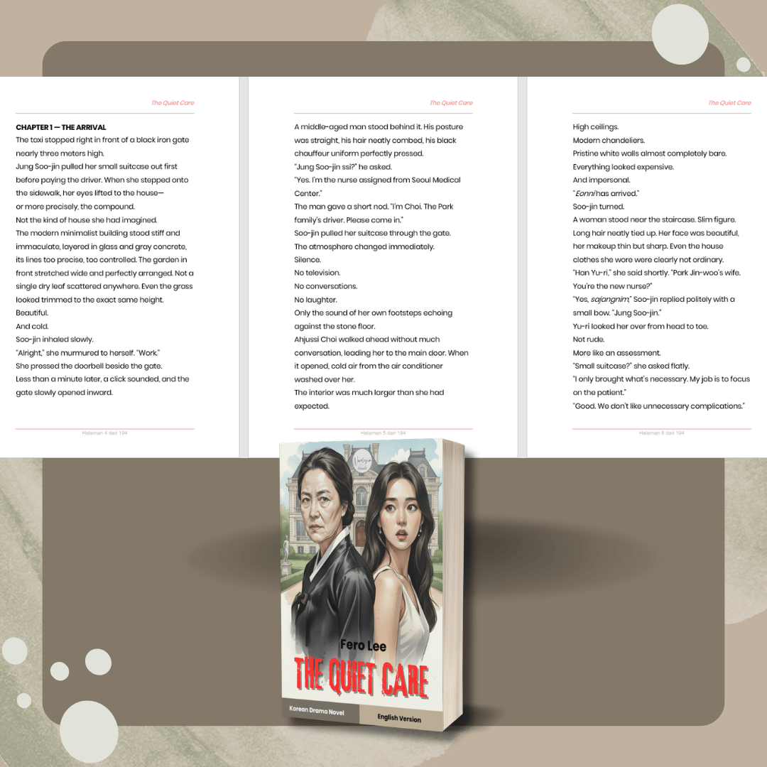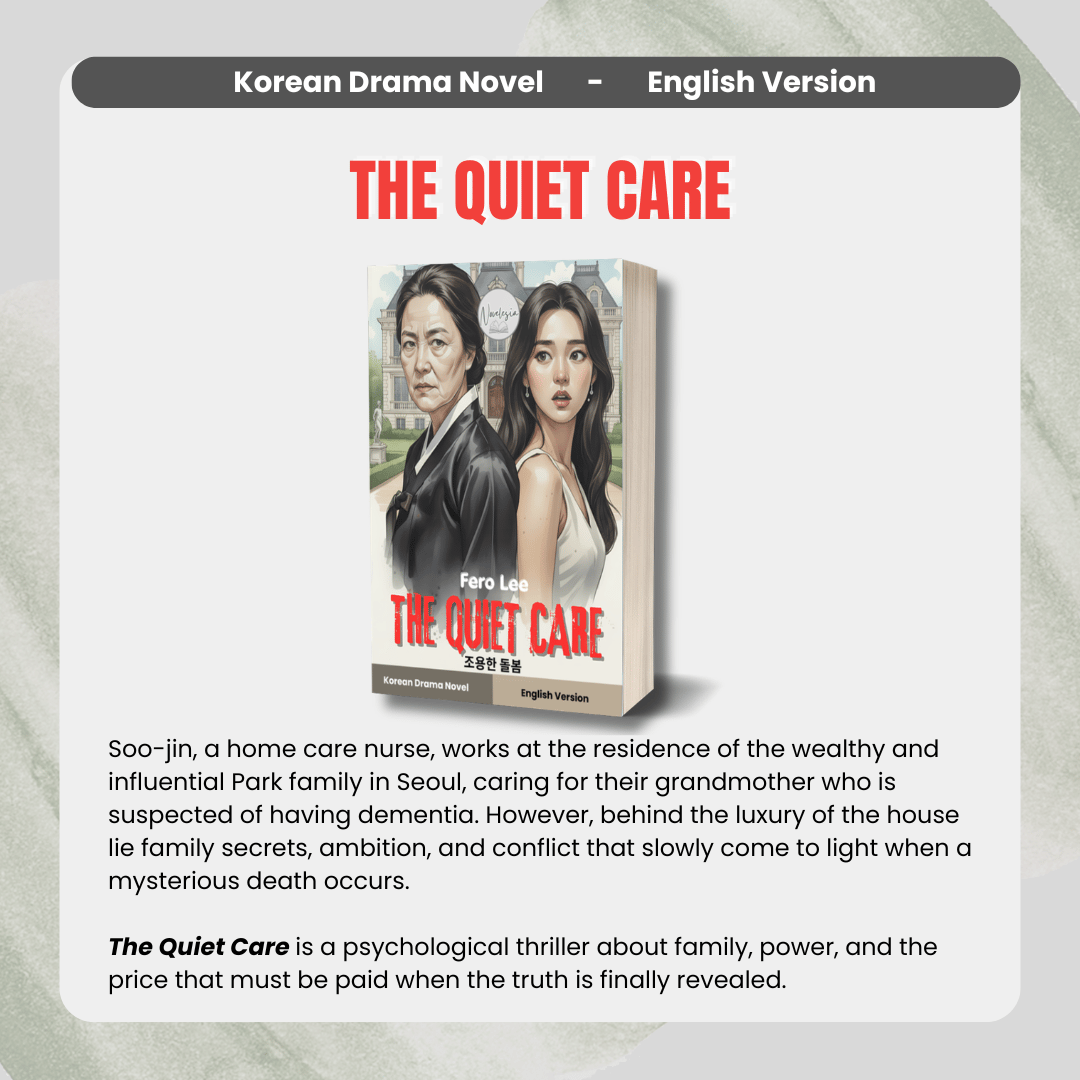 The Quiet Care by Fero Lee is a psychological mystery drama novel that follows Jung Soo-jin, a nurse working in the home of the wealthy Park family. She cares for Madam Park, who is believed to suffer from severe dementia, but gradually discovers strange signs that point to a hidden truth. In reality, the patient is only pretending to uncover the mystery behind her husband’s death. Soo-jin is drawn into a web of family intrigue filled with ambition, manipulation, and hidden danger. The tension rises as she becomes a suspect and her life is threatened. This novel delivers a story full of secrets, emotion, and unpredictable twists until the end.