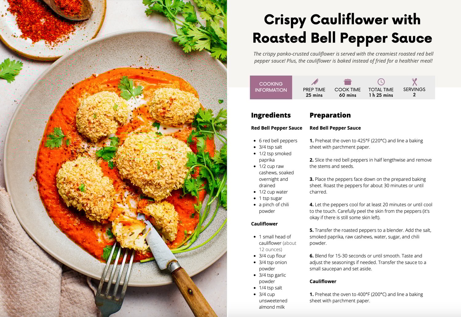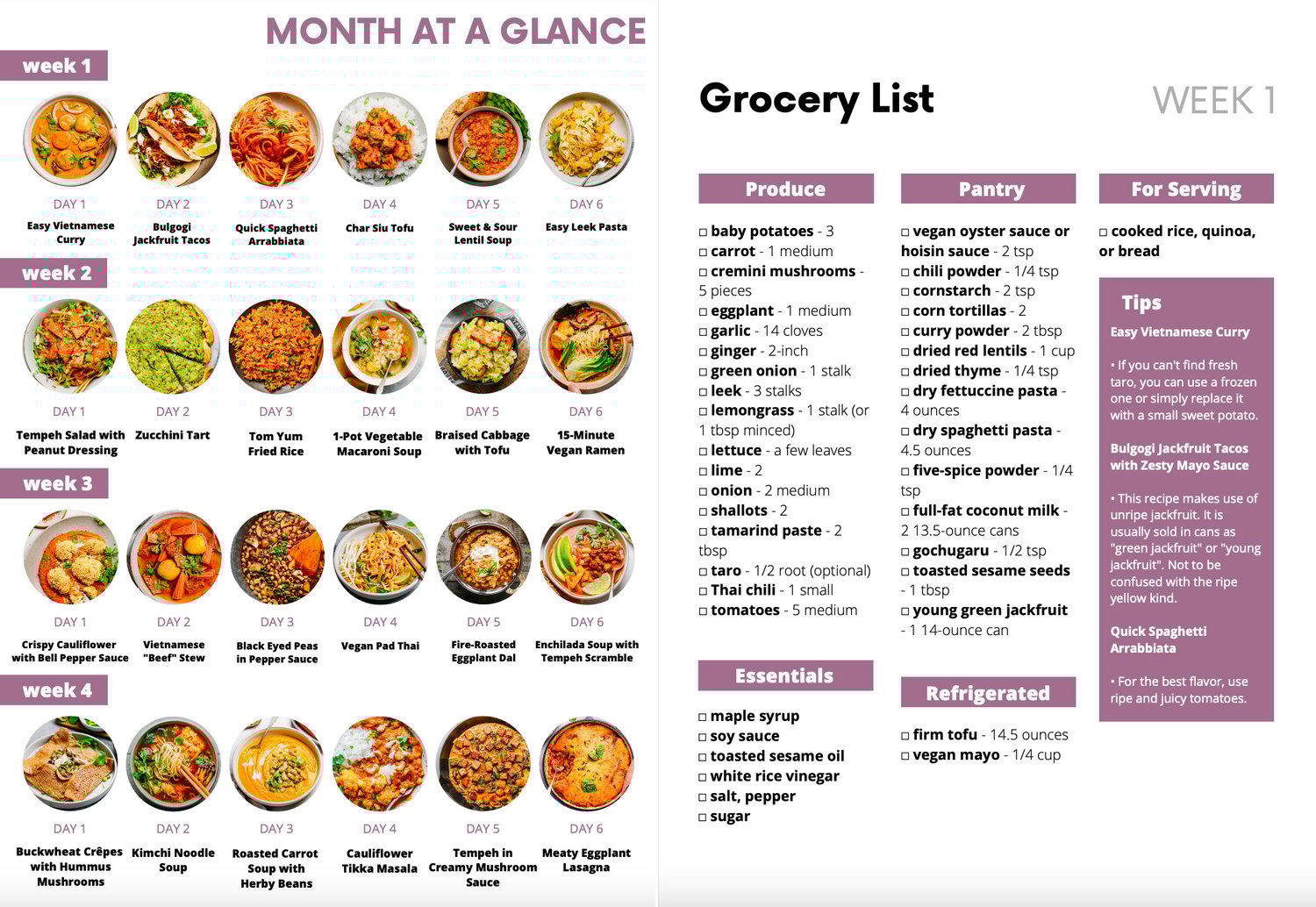 24 budget-friendly plant-based recipes that are flavorful and easy to prepare, weekly shopping lists, useful tips, nutritional values, and a mouthwatering photo for every recipe.