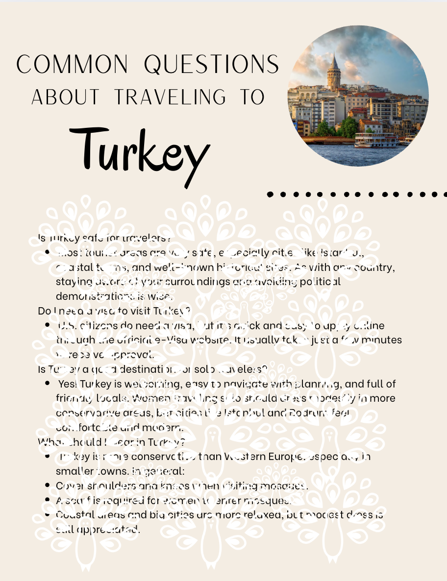 This professionally written Turkey FAQ sheet covers the essential details travelers want to know before their trip — including safety, dress codes, tipping, cultural expectations, transportation, and more.