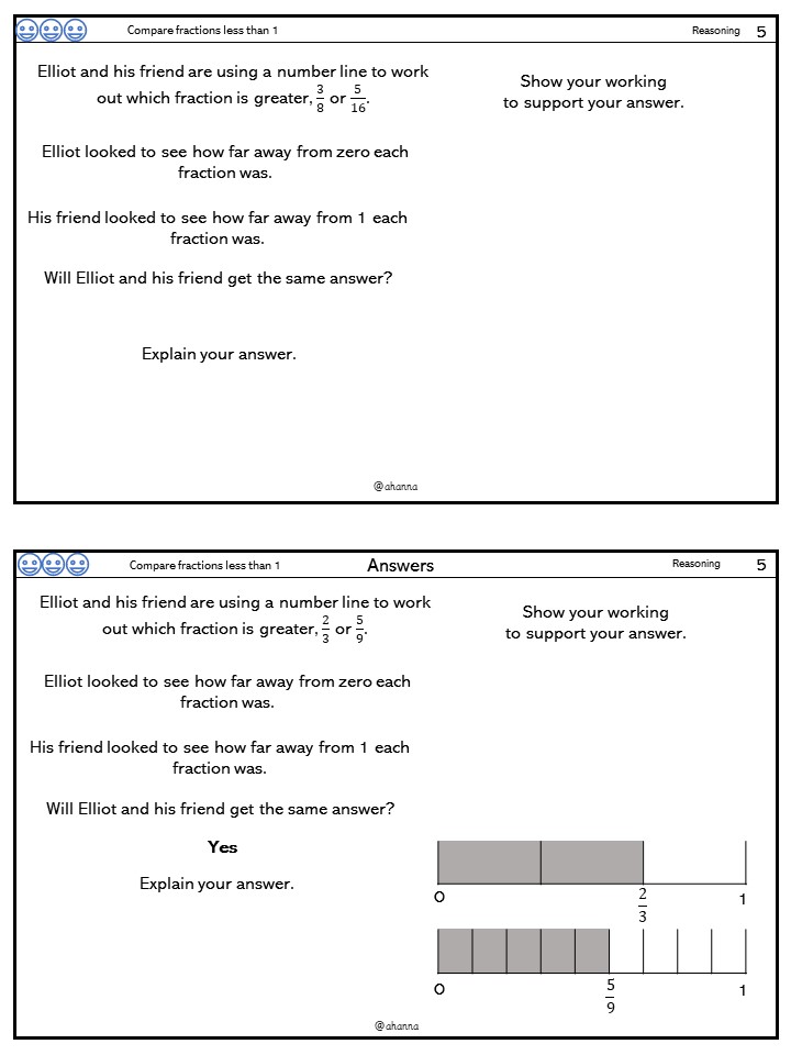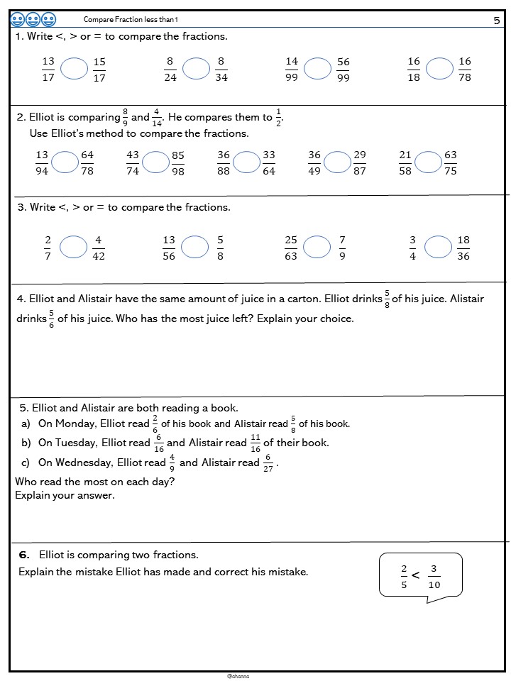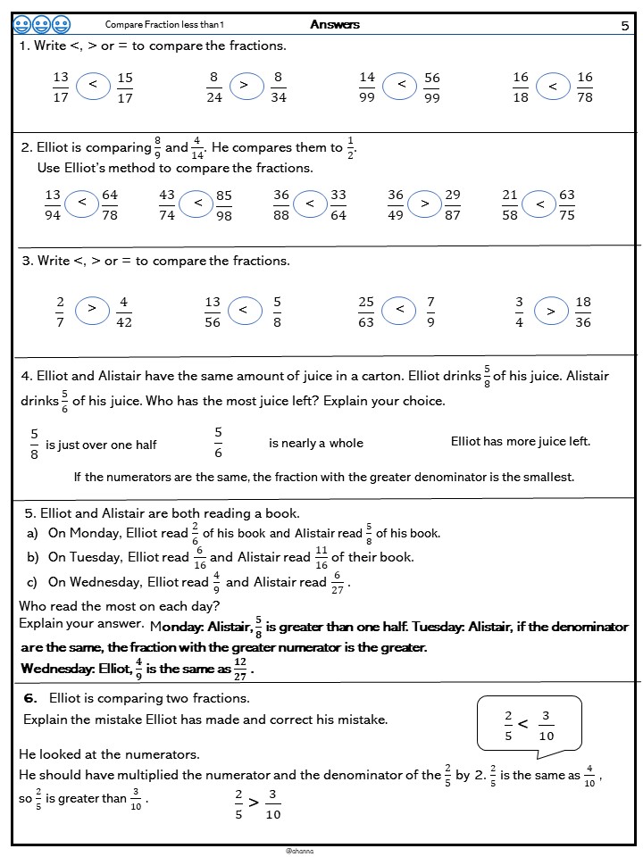 Children compare fractions and explain how they know if the fraction is smaller or greater. They are challenged by word problems and working out the greater fractions within the word problem. They correct