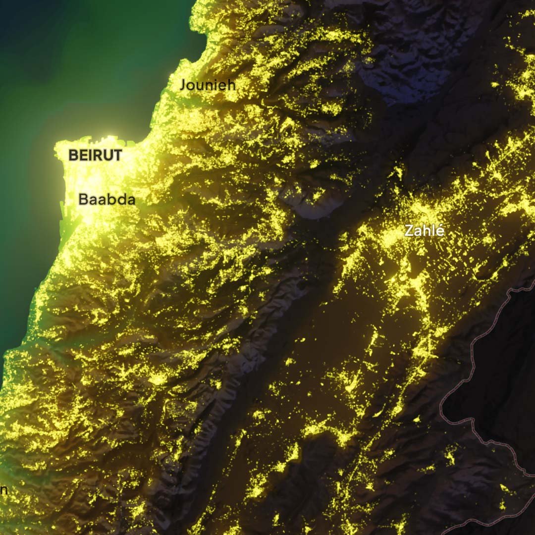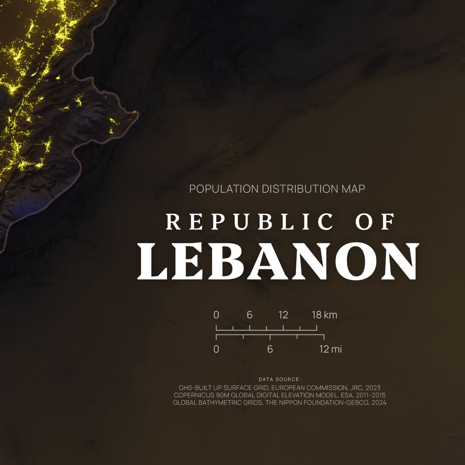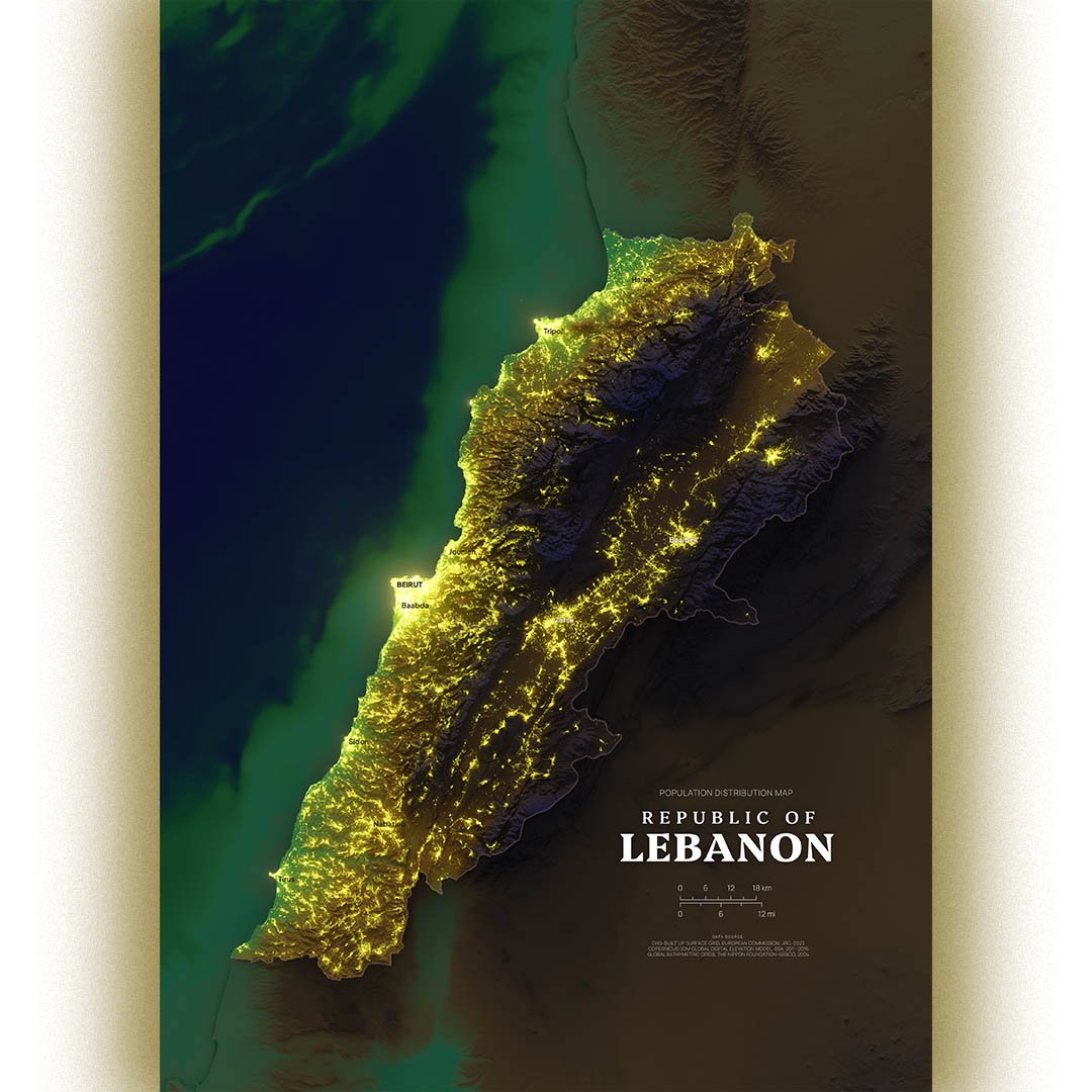 LEBANON shaded relief map day and night style, A2 size printable