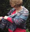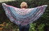 The Stormy Seas shawl is a half circle design, knit solely in garter stitch. It features the Sea Foam lace pattern. This pattern shows off wonderfully variegated and self-striping yarns with long to medium lengths of color. Sea Foam lace uses multiple yarn overs which are dropped on the following row. This, combined with the all-over garter stitch, gives an airy, textured, reversible fabric.