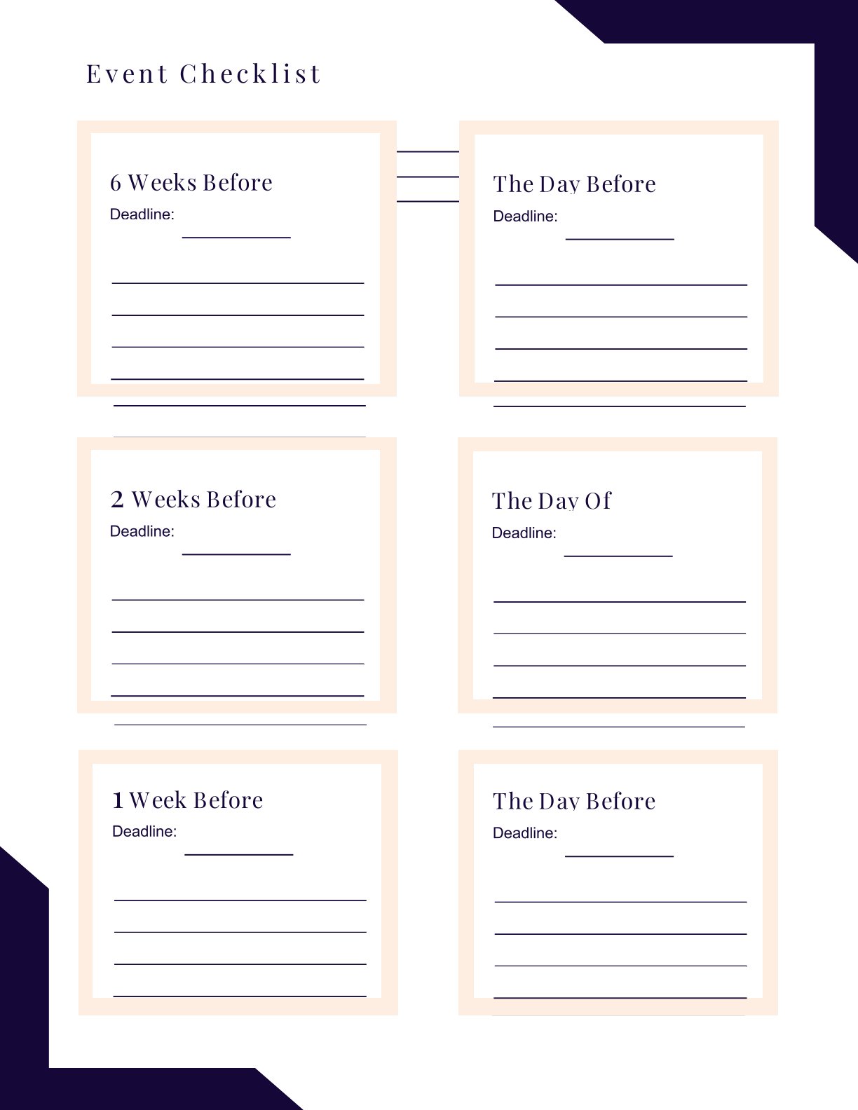 Event Checklist with clear milestones covering 6 weeks before, 2 weeks before, 1 week before, the day before, and the day of the event so you stay ahead of deadlines.