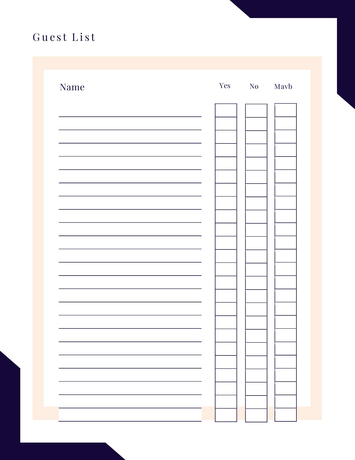 Guest List with names and an at-a-glance RSVP tracker (Yes / No / Maybe) to keep headcount accurate.
