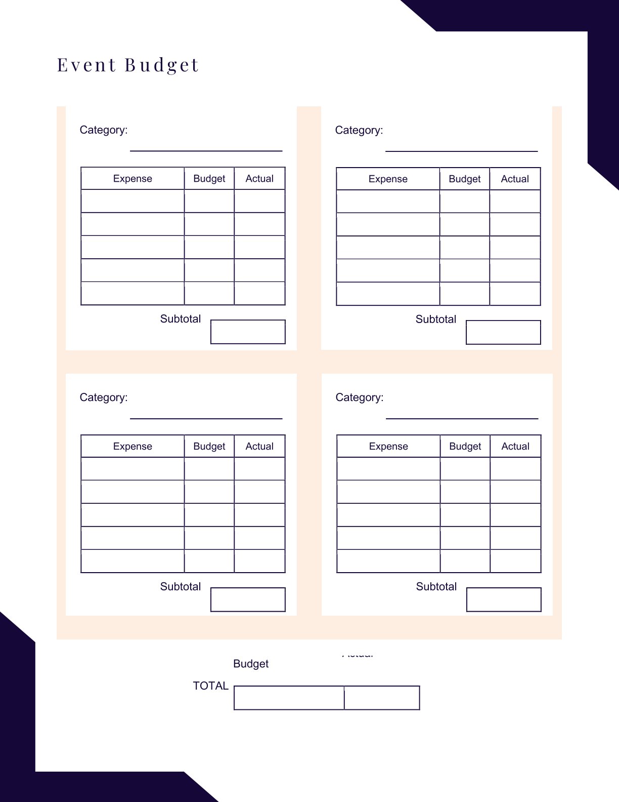 Event Budget with multiple category blocks, per-category subtotals, and a final TOTAL comparing Budget vs Actual so costs stay under control.