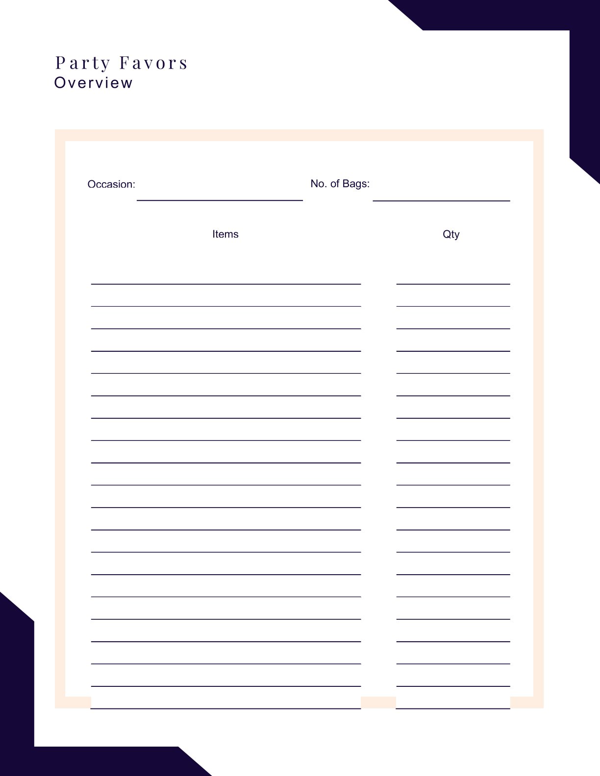 Download from your receipt or email. Start with Event Details, fill the countdown checklist, build your Guest List, allocate your Budget categories, and finalize Party Favors. Print fresh copies for every event you host.