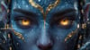 This breathtaking close-up portrait features a blue, otherworldly feminine figure with glowing golden eyes, crystalline skin texture, and flowing braided details. Subtle gold vein accents trace across the face like living energy, creating a powerful contrast between calm elegance and inner strength.