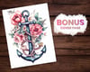 25 Nautical Love Coloring Book, Adults + kids Instant Download - Grayscale Coloring Page Printable PDF, Ocean, Flowers, Anchors, wheel