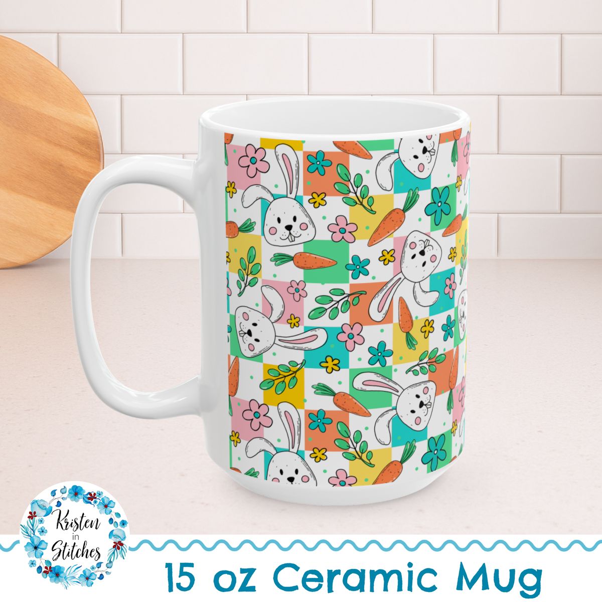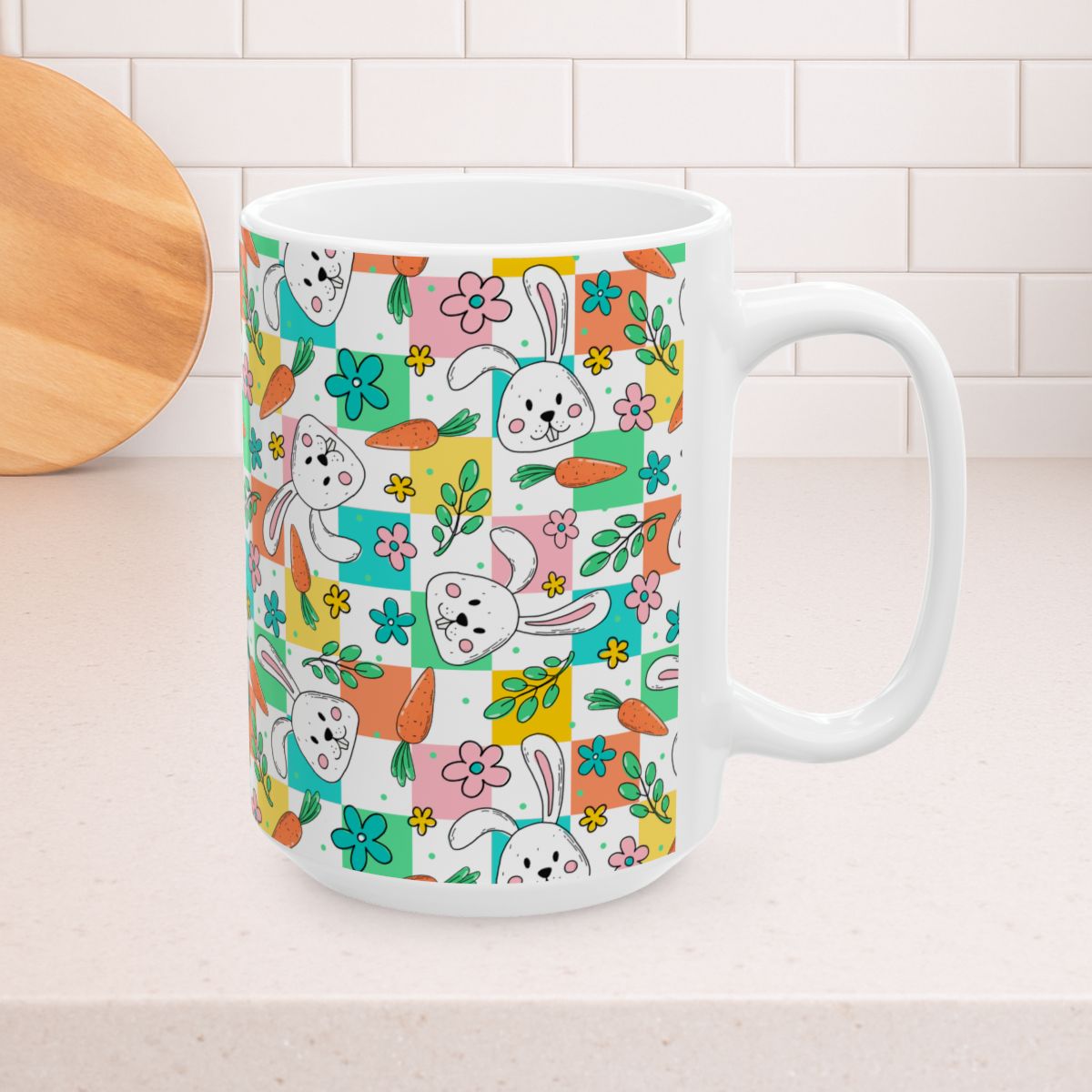 Easter Bunny 15oz Ceramic Mug, Large Coffee Cup, Pastel Checkerboard