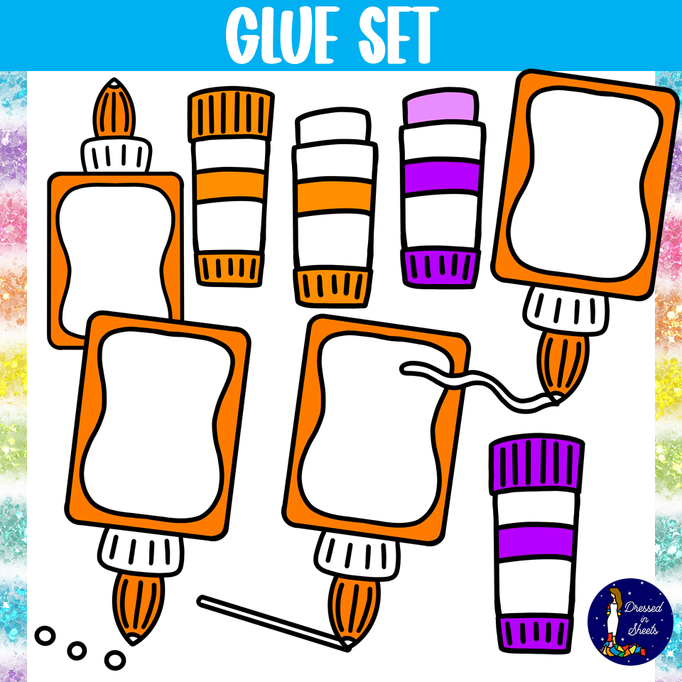 Include glue bottle in dot dot position, glue bottle with squiggly lines, glue bottle with straight line, open glue sticks, and closed glue stick.