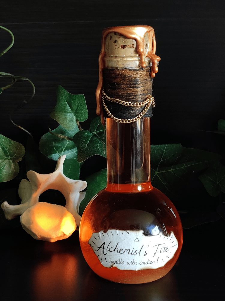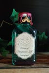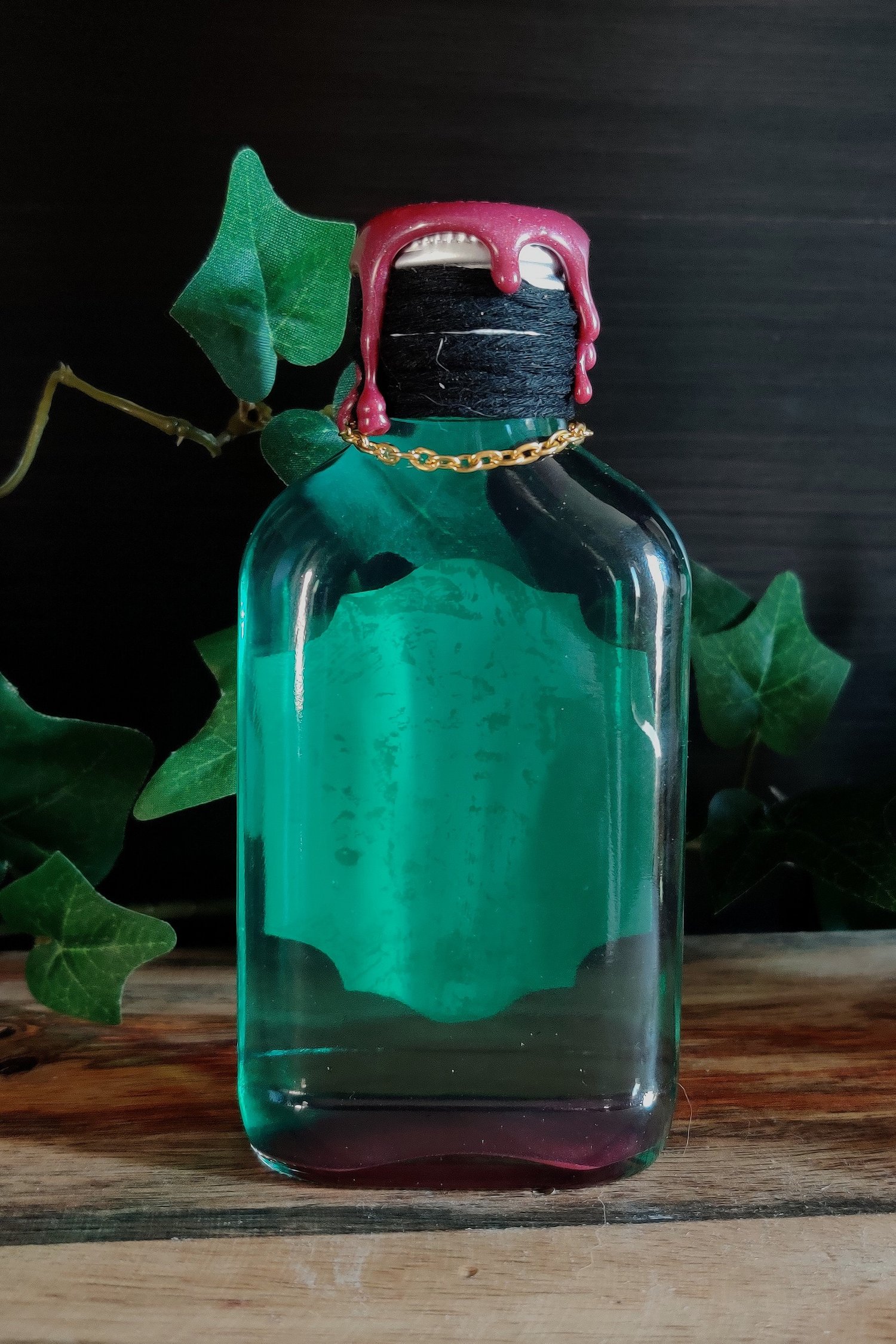 Pullossa on sinivihreää nestettä ja se on koristeltu käsintehdyllä etiketillä, narulla sekä kultaisella ketjulla.