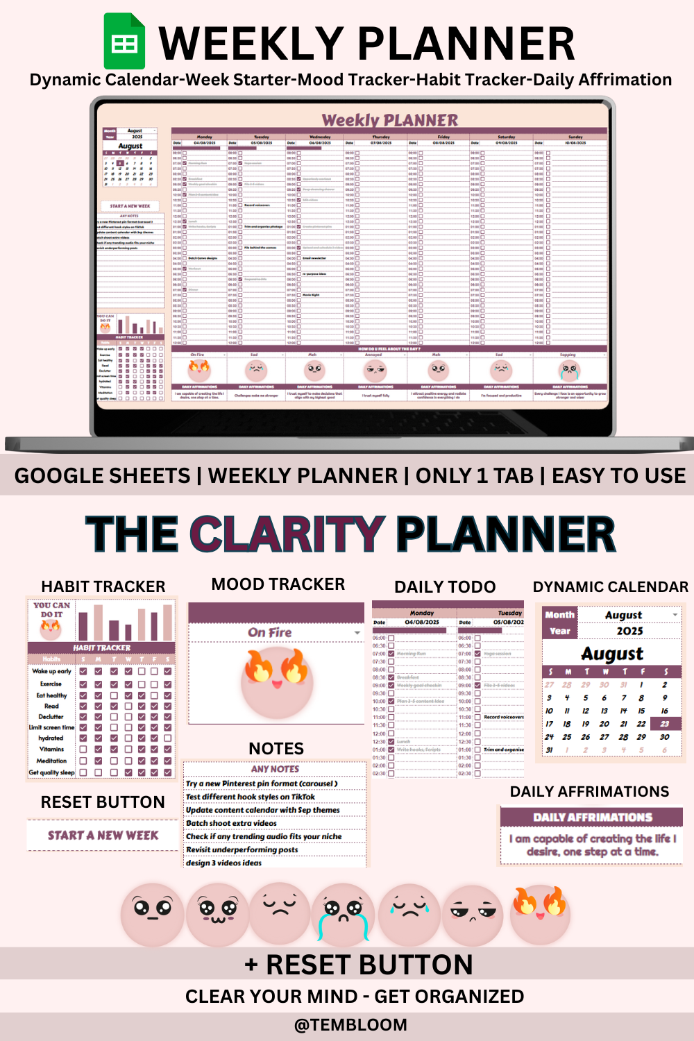 Take control of your week with The Clarity Planner — a clean, smart, and powerful Google Sheets template designed to help you plan with intention.
