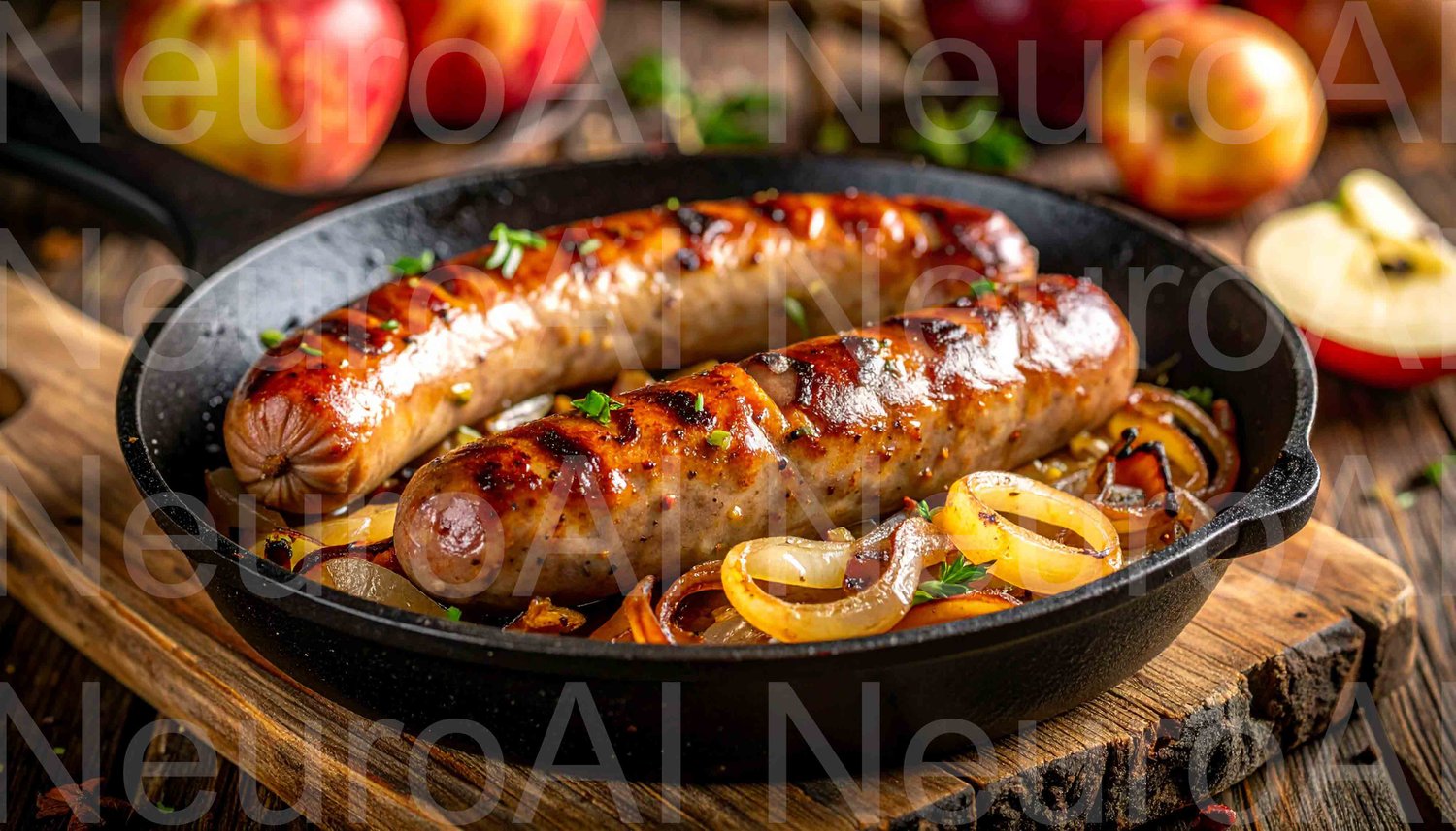 Juicy grilled sausages with caramelized onions in cast iron pan