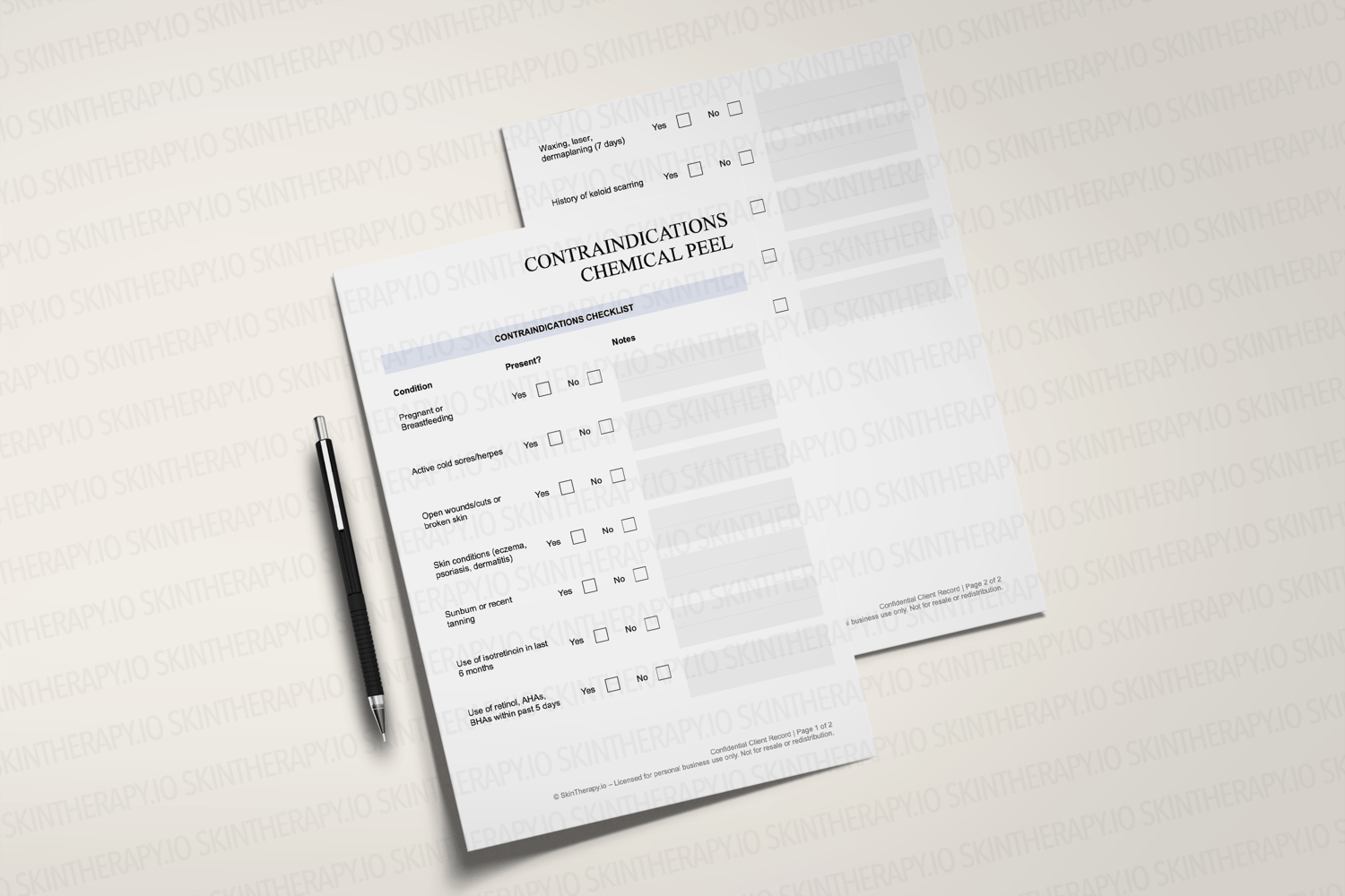 A clinic-grade Chemical Peel Contraindications Checklist for beauty & aesthetics practitioners. Designed to support safe screening, clear documentation, and professional client record-keeping before treatment.