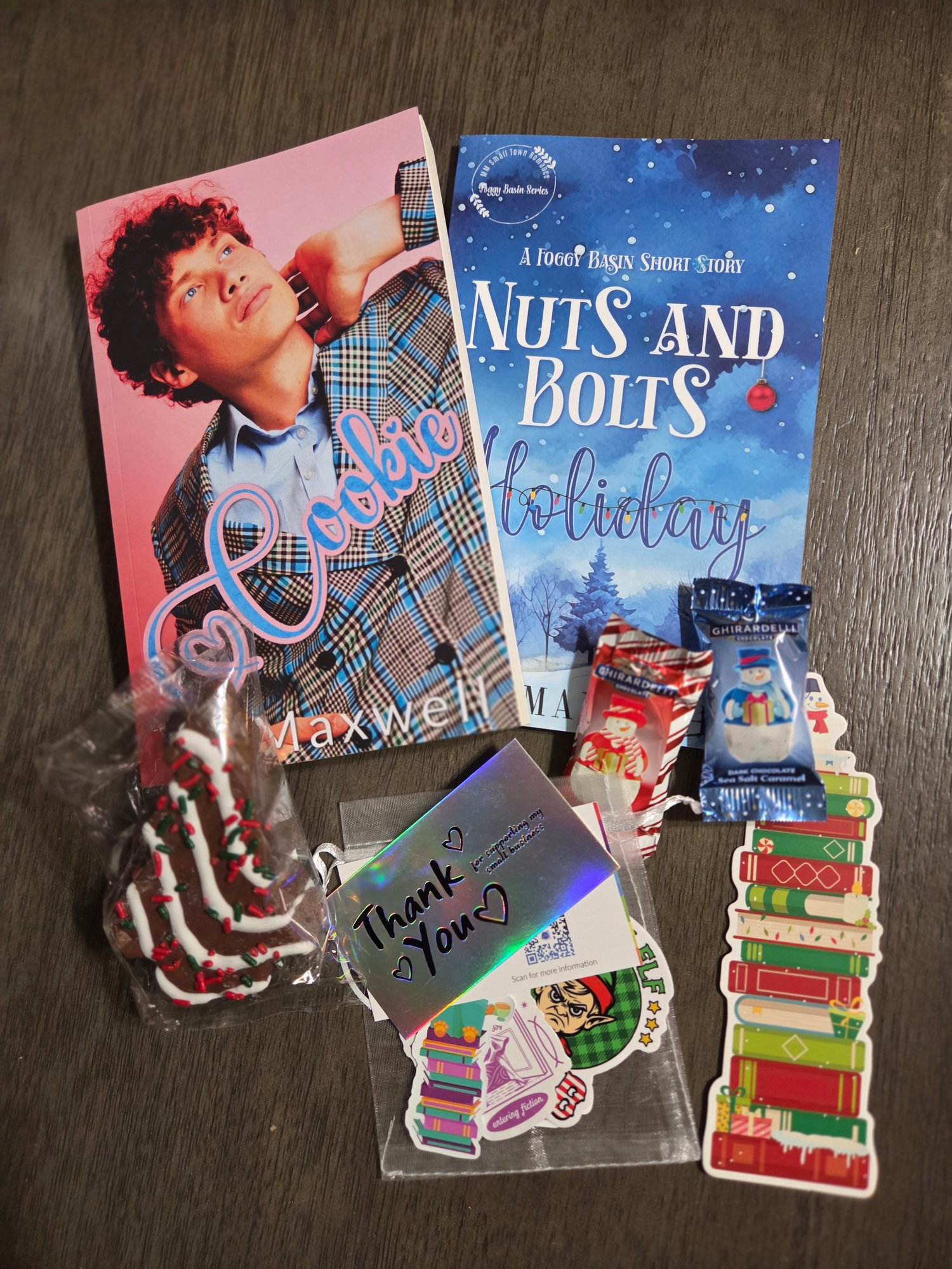 Also receive a Christmas bookmark and several stickers, a custom BL Maxwell stickers, Pride and a Little Debbie Christmas tree cake and Ghirardelli chocolate