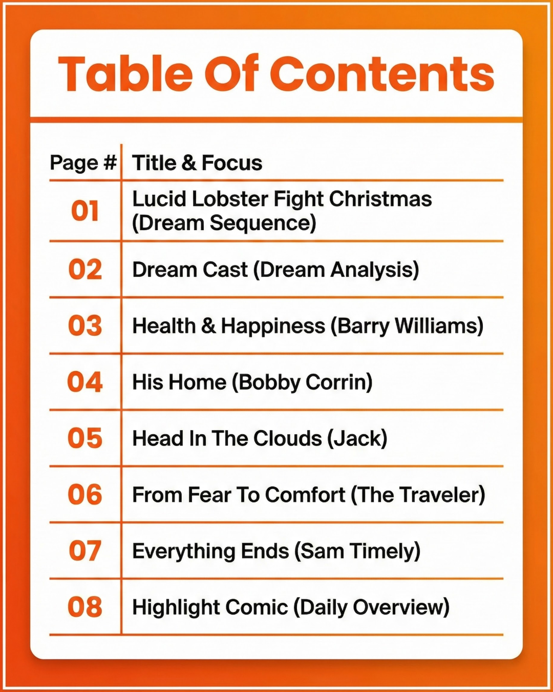 This is an anthology of 8 one-page comics, all created in a single day.