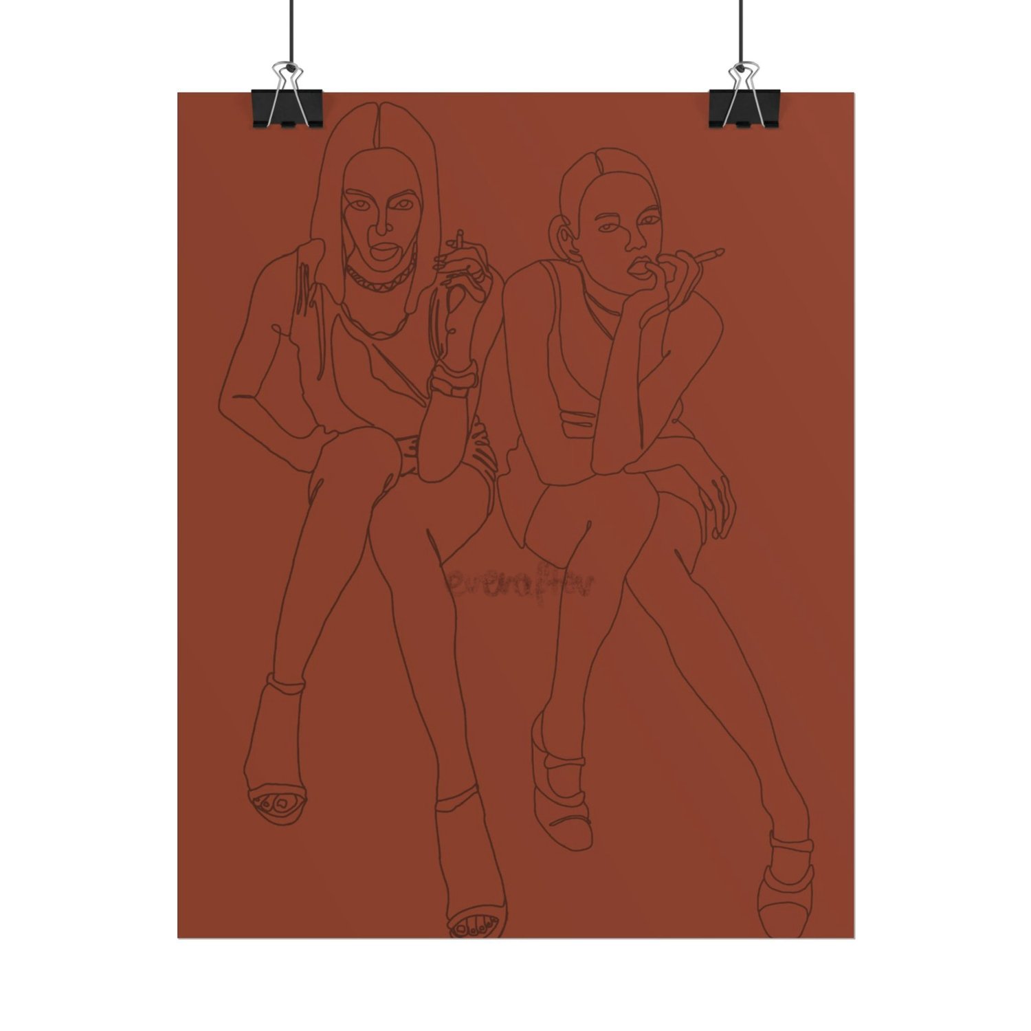 A bold line-art illustration of two confident women seated side-by-side, each holding a cigarette with nonchalant elegance. Their relaxed postures and expressive facial features convey a sense of modern attitude and self-assurance. The minimalist, monochromatic style emphasizes their fashion-forward outfits and high-heeled footwear, capturing a moment that feels both intimate and stylishly rebellious.