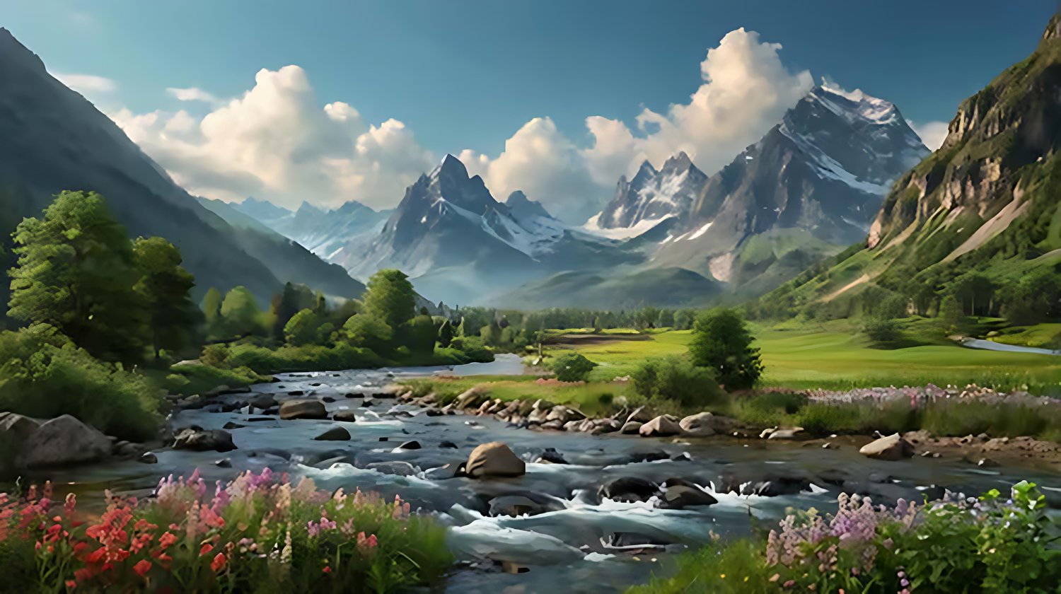 This beautiful AI wall art piece depicts a tranquil mountain view landscape. The photograph will be printed on Hahnemühle gallery fine print paper. The size is A2 (420mm x 594mm)