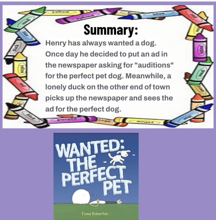 This 35-page ELA resources activity packet was created to be used with Wanted: The Perfect Pet by Fiona Roberton. A fun story to read to children while introducing persuasive writing to students.