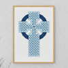 A counted cross stitch pattern of a Celtic cross, showcasing beautiful Celtic knotwork.
