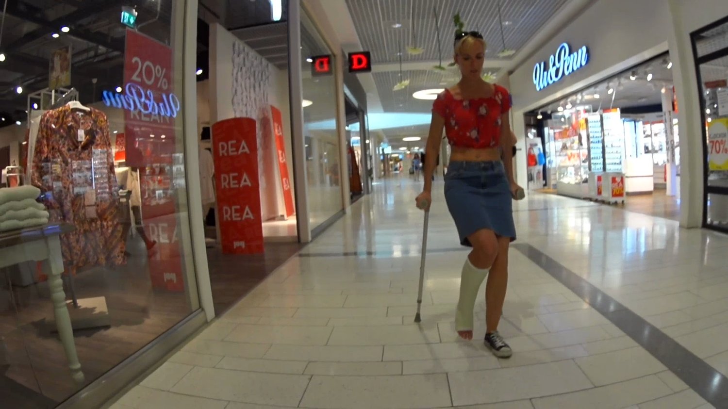 Who do we meet inside the mall if not Stefanie who comes crutching with a white short leg cast?Stefanie is wearing a skirt and sweater and has a flat shoe on her left foot.She crutches to a small "cozy corner" located in the middle of the mall and sits down on one of the chairs and puts up her injured foot so we can see it properly while she rests a bit and gets new strength.
