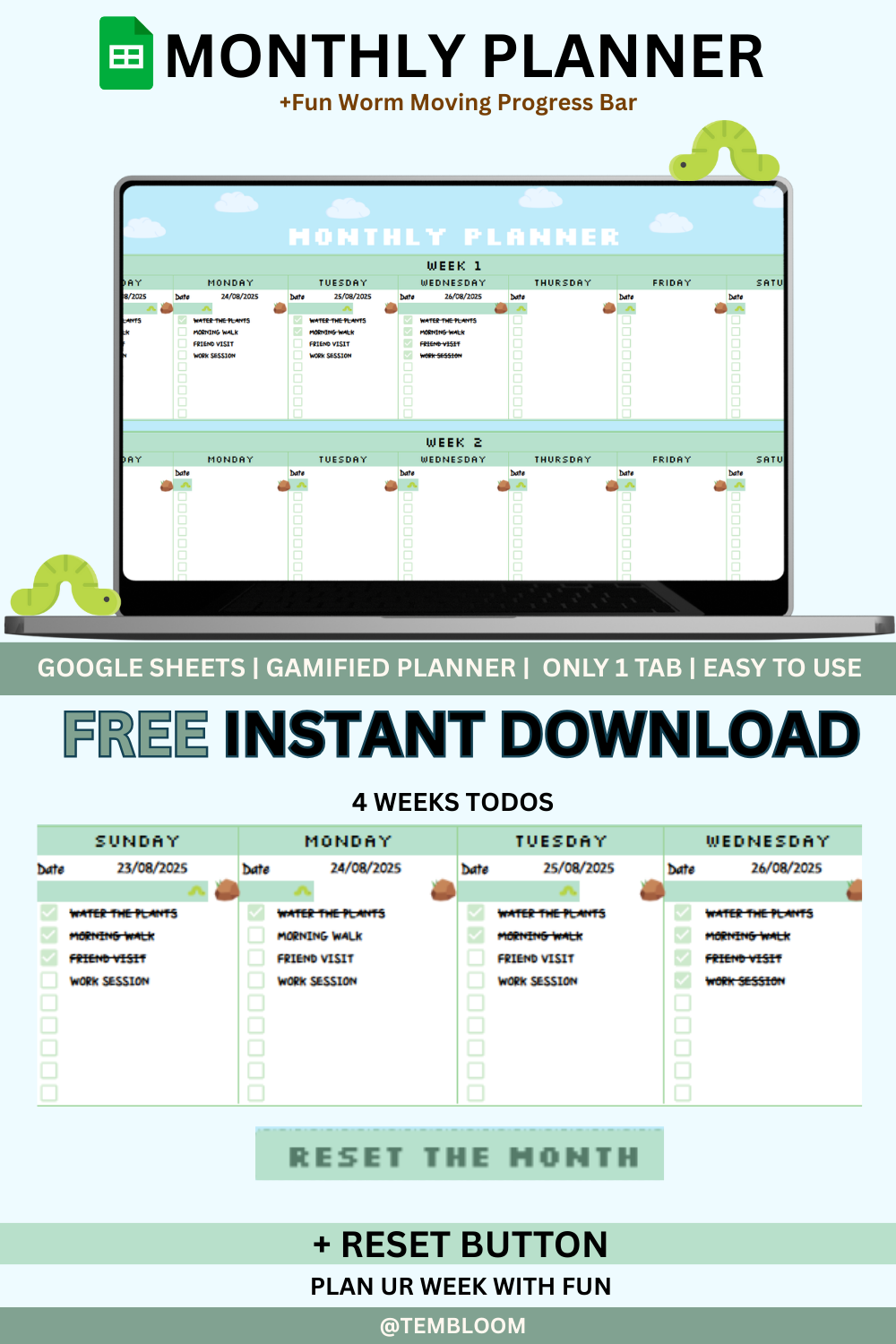 Designed in an interactive Google Sheets format, this unique planner lets you track your progress with an adorable worm-style progress bar, dynamic day labeling, and reset functionality to start fresh each month.